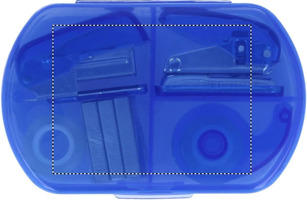Set de artigos de escritório indispensáveis. Inclui dispensador de fita-cola, mini agrafador, mini furador, 300 agrafes e rolo de fita-cola. Apresentada em caixa compacta de plástico translucido.Conj. Escritório caixa plástica