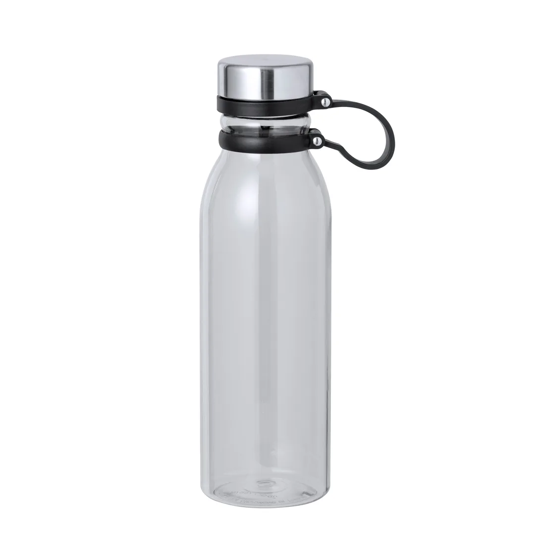 Garrafa em RPET de 830 ml de capacidade. Tampa de segurança de rosca em aço inox e original fita de silicone para um fácil transporte. Disponível numa variada gama de cores translúcidas. Livre de BPA e apresentada numa atrativa caixa de design kraft. O material RPET é elaborado a partir de plástico reciclado, para assim fomentar a reutilização de resíduos plásticos e ajudar à sustentabilidade do planeta.RPET/ Aço Inox830 ml
