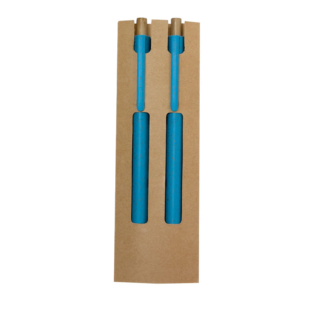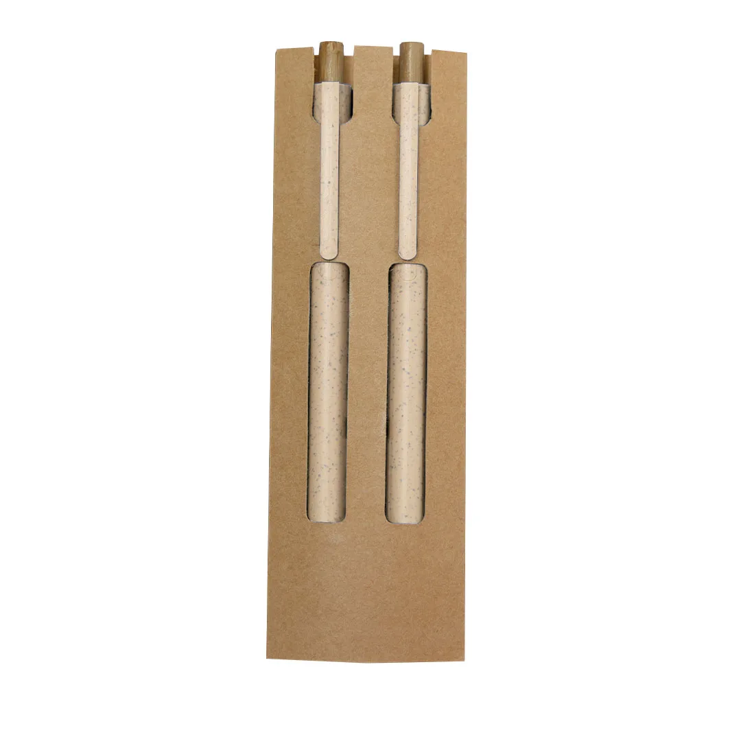 Conjunto de caneta e lápis eterno fabricados em palha de trigo e bambu. Caneta com mecanismo de pressão fabricada em bambu de tinta azul e clipe combinando. E lápis com mecanismo de pressão fabricado em bambu com ponta eterna, para assim usar sempre o mesmo lápis e não gerar resíduos. Apresentados em estojo de papelão reciclado. Com distintivo de palha de trigo impresso.Elaborado com elementos vegetais para assim fomentar a utilização de matérias-primas naturais e reduzir as emissões poluentes.Palha de Trigo/ ABS/ BambuEsferográfica e Lápis Eterno