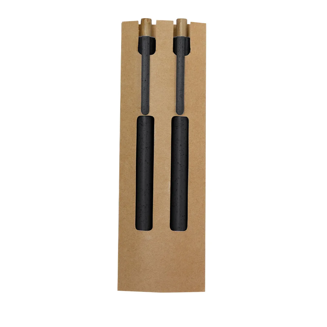 Ref: BEC32912MOConjunto de caneta e lápis eterno fabricados em palha de trigo e bambu. Caneta com mecanismo de pressão fabricada em bambu de tinta azul e clipe combinando. E lápis com mecanismo de pressão fabricado em bambu com ponta eterna, para assim usar sempre o mesmo lápis e não gerar resíduos. Apresentados em estojo de papelão reciclado. Com distintivo de palha de trigo impresso.Elaborado com elementos vegetais para assim fomentar a utilização de matérias-primas naturais e reduzir as emissões poluentes.
