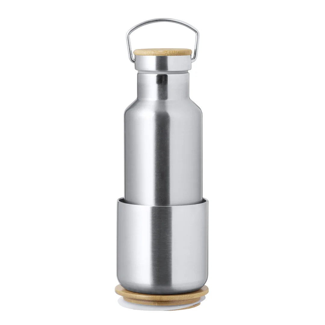Prático set de garrafa e copo térmico em aço inoxidável. Inclui garrafa térmica de 500 ml de capacidade fabricada em aço inoxidável, tampa de segurança de rosca com base em bambu e inclui asa de transporte. Além disso, contém 1 copo de aço inoxidável com capacidade de 300 ml e tampa de bambu com fecho de pressão. Apresentado em caixa de design kraft .Aço Inox/ BambuGarrafa Térmica 500 ml. Copo Térmico 300 ml