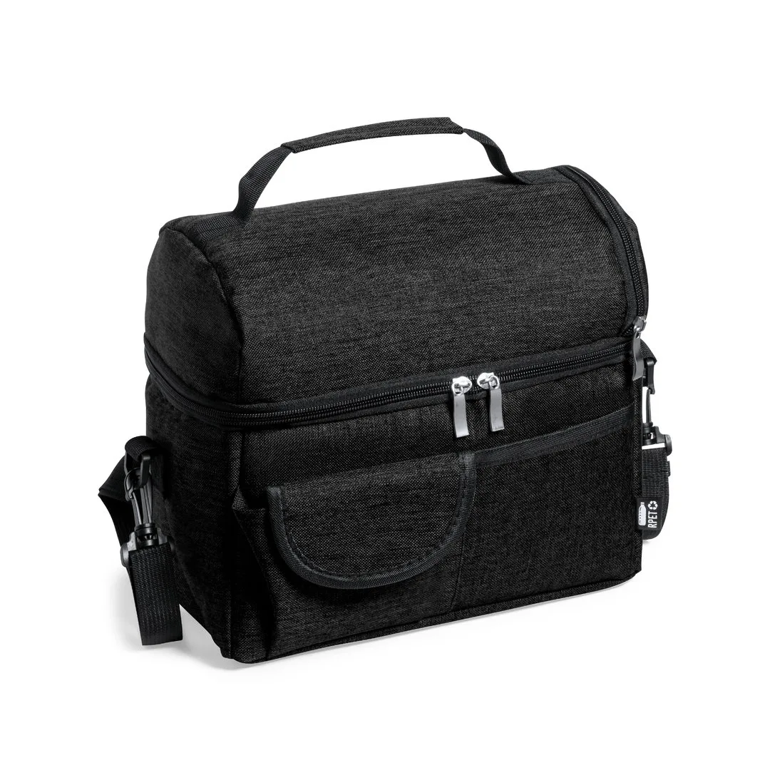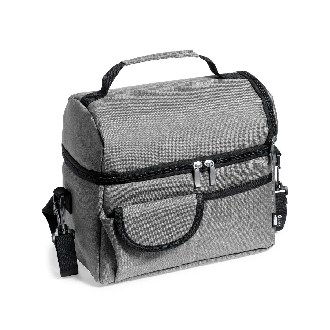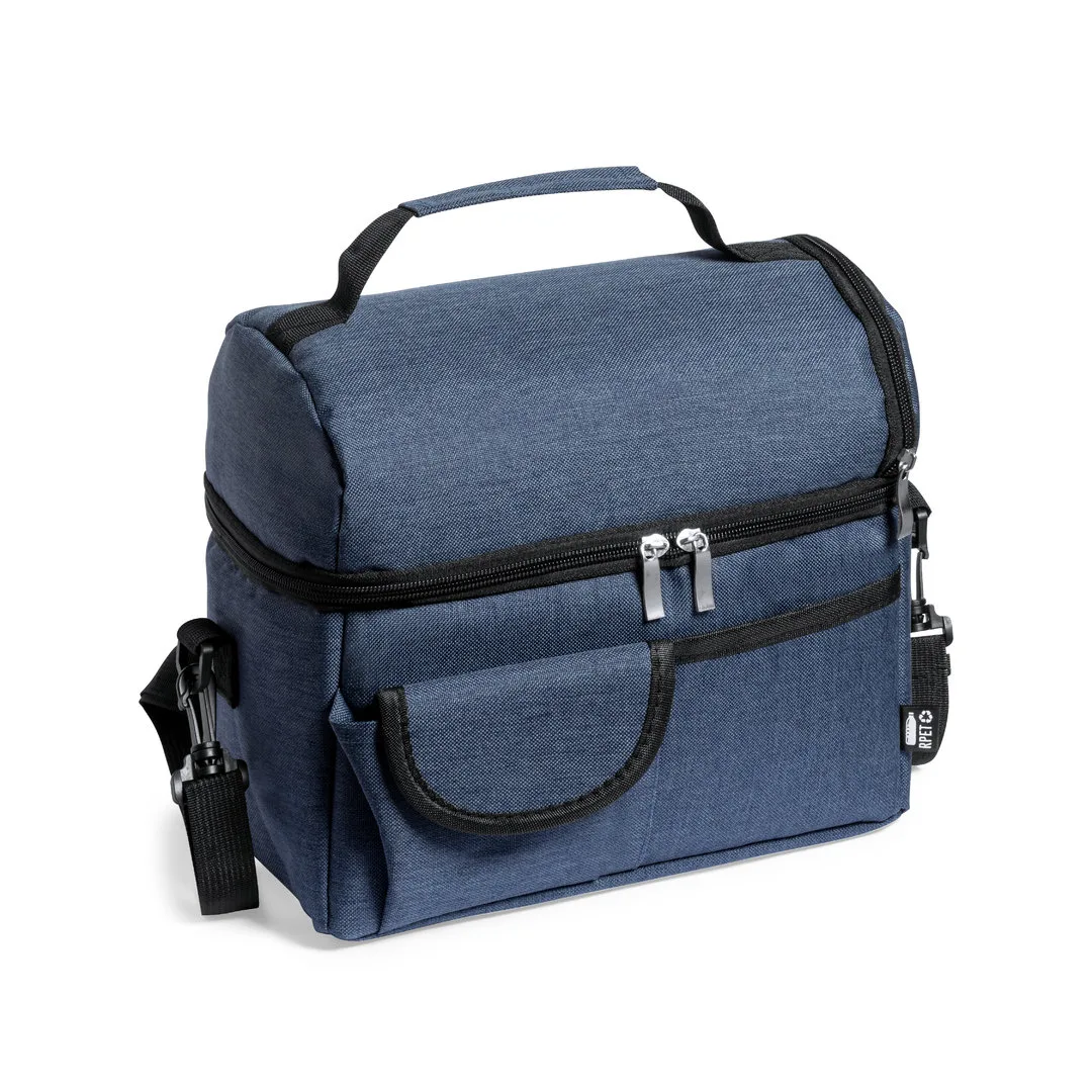 Bolsa refrigeradora em resistente 600D RPET. Inclui 2 compartimentos independentes, com fecho de correr e puxadores metálicos. Interior isotérmico em PEVA, com fita tiracolo ajustável e acolchado para ombro a condizer. Bolso traseiro de rede elástica e dois bolsos frontais, um deles com fecho de velcro. Etiqueta exterior com distintivo RPET, disponível numa variada gama de cores. O material RPET elabora-se a partir de plástico reciclado, para assim fomentar a reutilização de resíduos plásticos e ajudar a sustentabilidade do planeta.Poliéster 600D RPET/ PEVA