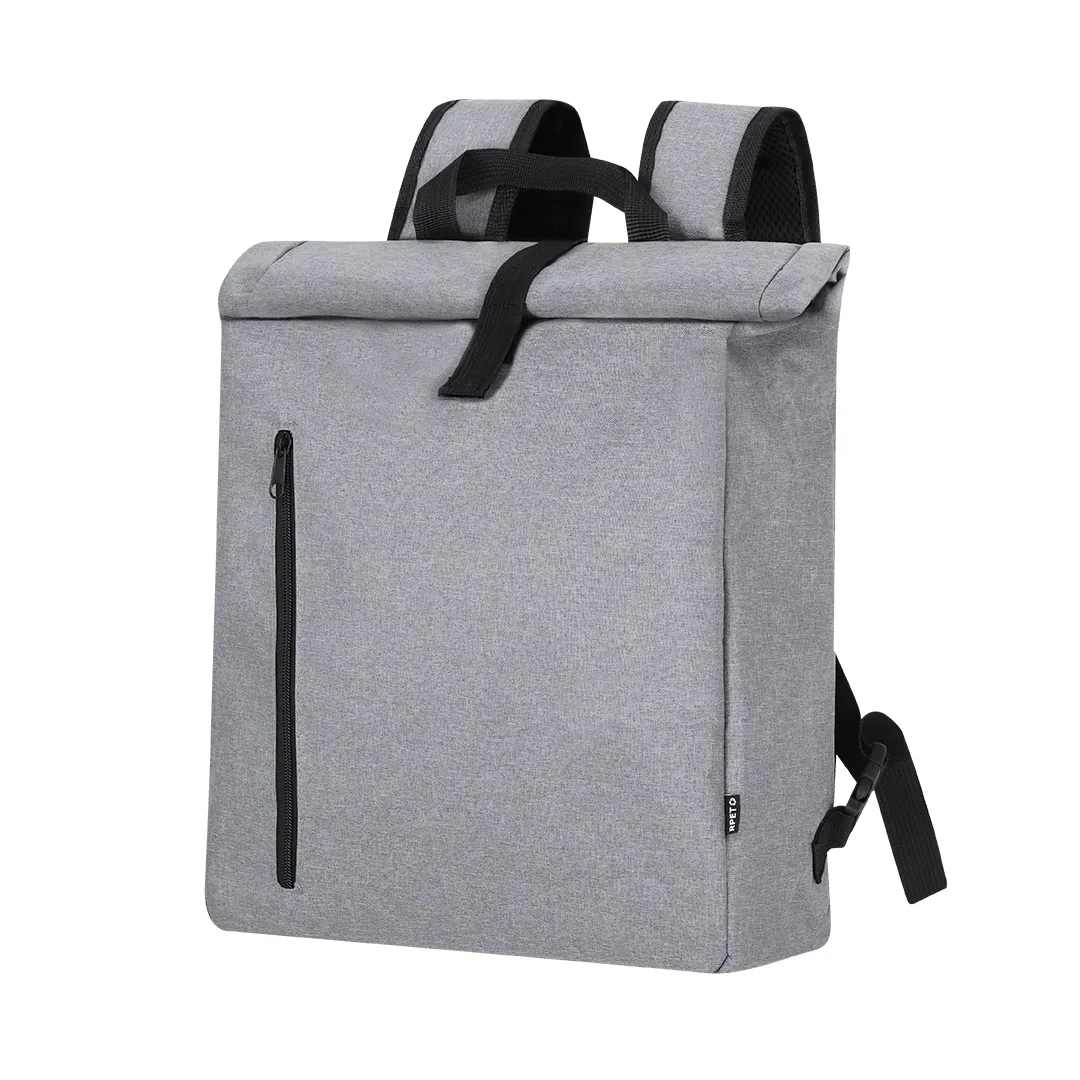 Mochila para bicicleta fabricada em resistente RPET 600D. Versátil e com fecho de fivela, inclui um prático bolso frontal com fecho de correr. Na parte traseira possui encaixes específicos universais para bicicletas, garantindo maior conforto e segurança em movimento. Possui também uma alça de ombro acolchoada e ajustável, para que possa ser transportado com maior conforto quando desconetado da bicicleta. Etiqueta exterior com logotipo RPET.O material RPET é elaborado a partir de plástico reciclado, para assim promover a reutilização de resíduos plásticos e ajudando a sustentabilidade do planeta.Poliéster 600D RPETAlças Acolchoadas