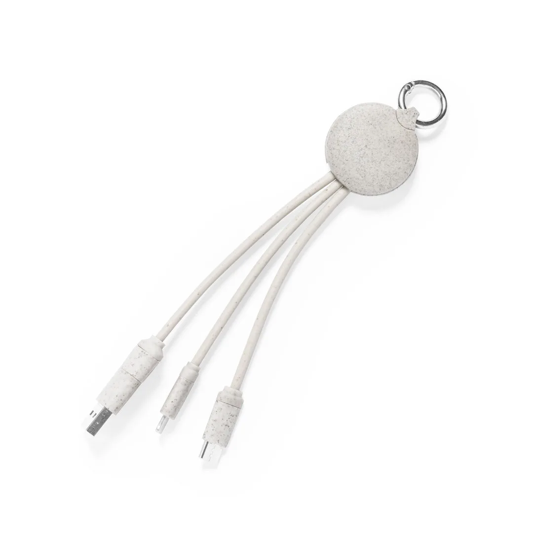 Cabo carregador com argola fabricado em palha de trigo, para assim fomentar a utilização de matérias-primas naturais e reduzir as emissões contaminantes. Inclui conexões de entrada Tipo C e USB saídas Lightning, Micro USB e USB. Apresentado numa bolsa individual de design kraft.Palha de Trigo/ ABSConexão Micro USB, Tipo C e Lightning 5V DC 2.4A
