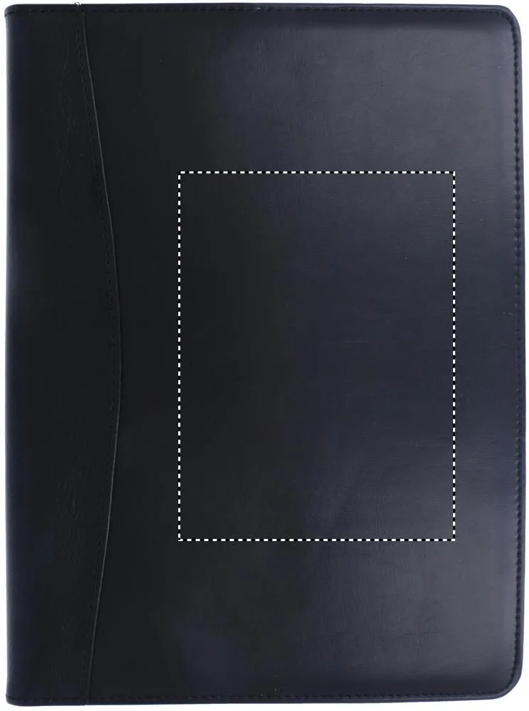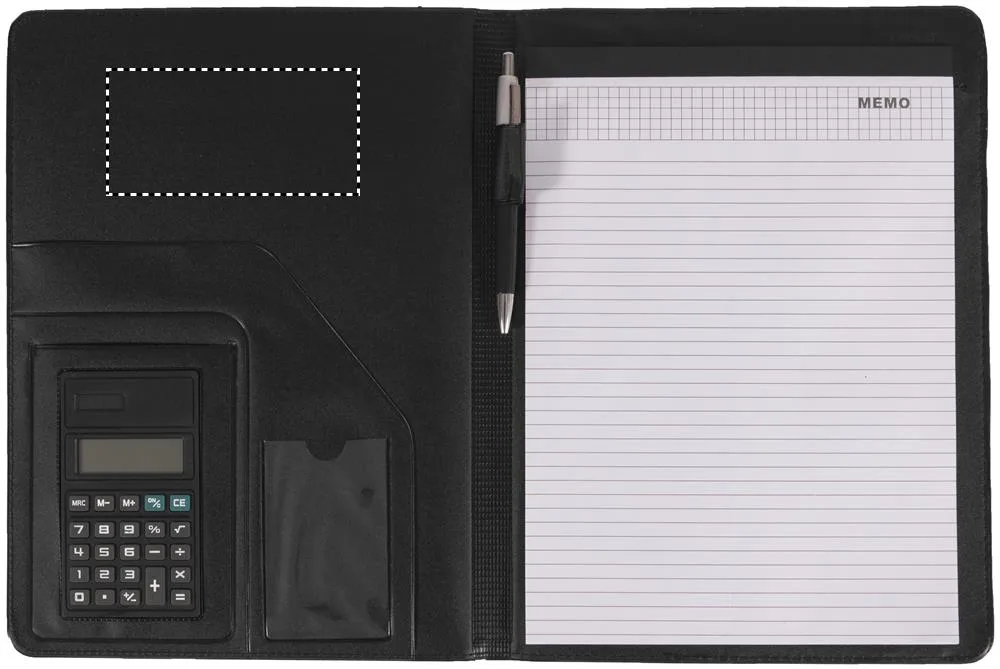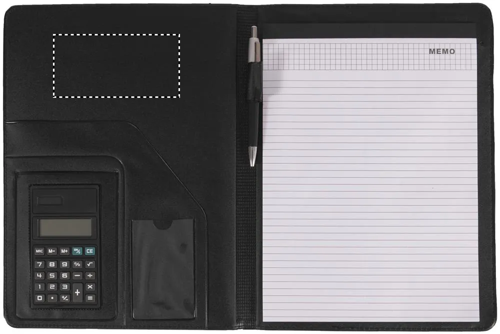 Porta-documentos A4 com calculadora solar, esferográfica com tinta azul e bloco listado de 20 folhas, fabricado em polipelePasta em imitação de pele