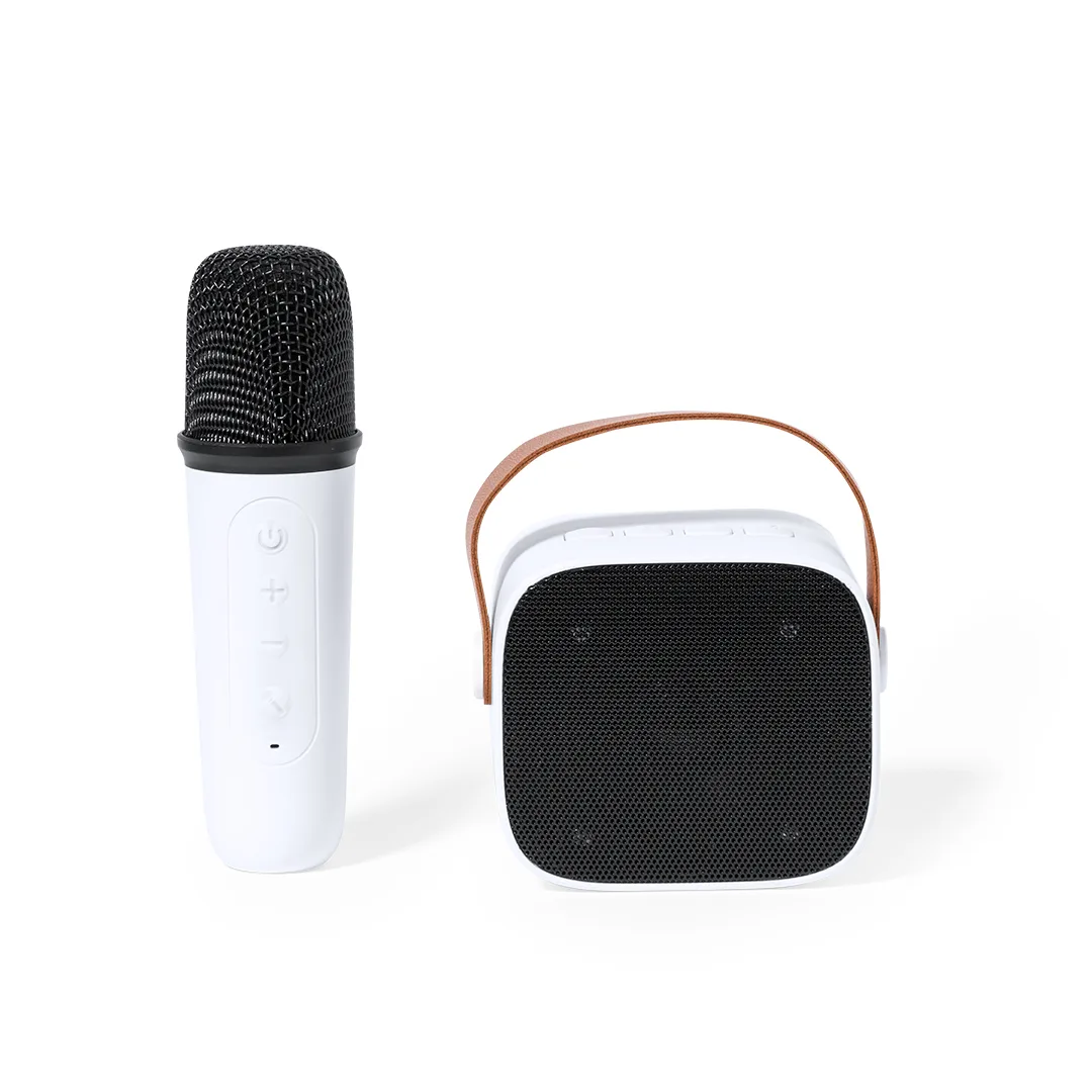 Original pack de karaoke com altavoz e microfone. O seu compacto tamanho e a facilidade da conexão Bluetooth® convertem-no no acessório ideal para desfrutar em qualquer lugar e momento. Inclui: Coluna com prática pega de transporte em PU. 5W de potência e bateria de 1200 mAh de longa duração.Microfone com design ergonómico a condizer para desfrutar das melhores canções.Apresentado em caixa de design Kraft. Disponível manual de instruções em espanhol e inglês.Conexão Bluetooth. Potência Sonora 5W. Bateria 1200 mAh. Microfone Incluído