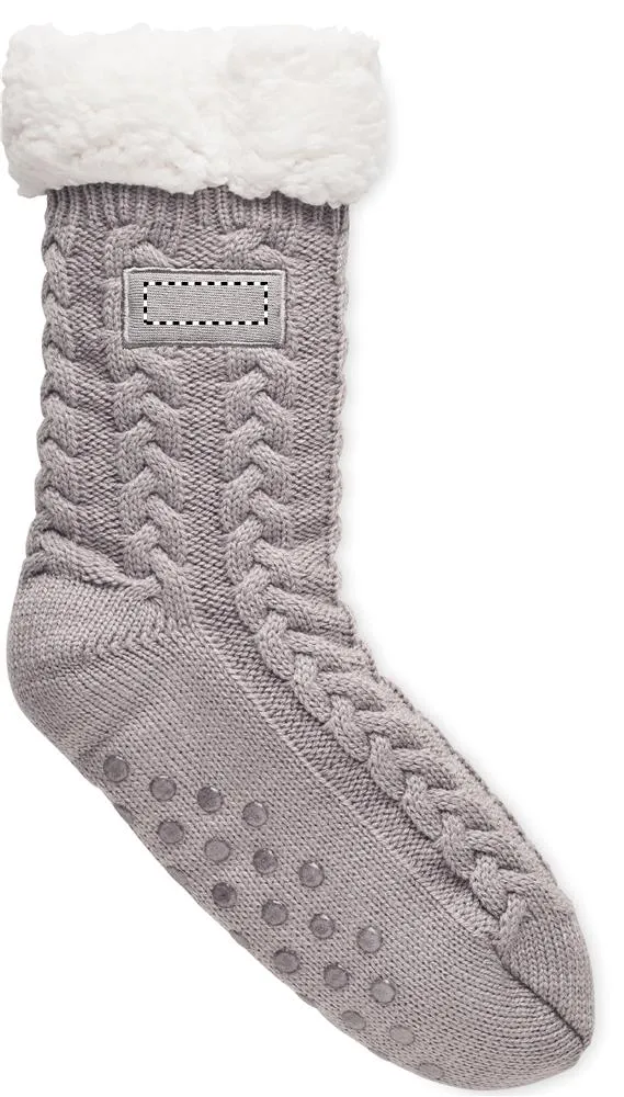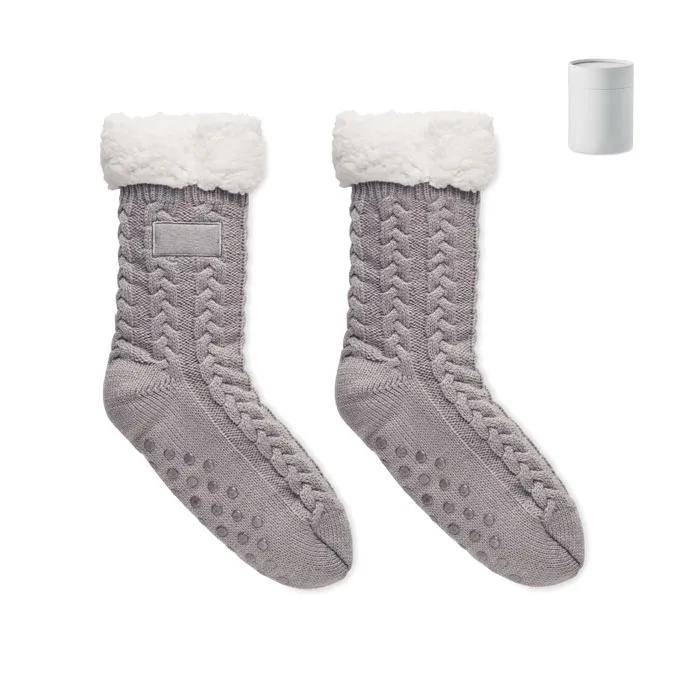 Par de meias-calças de malha de cabo com pinças antiderrapantes no fundo em fio acrílico e forro de sherpa de 240 gr/m². Apresentado em caixa de oferta. Tamanho M= 36-39.Par de chinelos de meias M