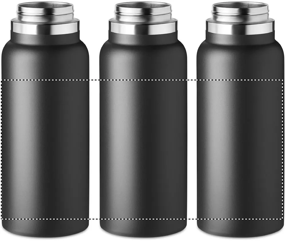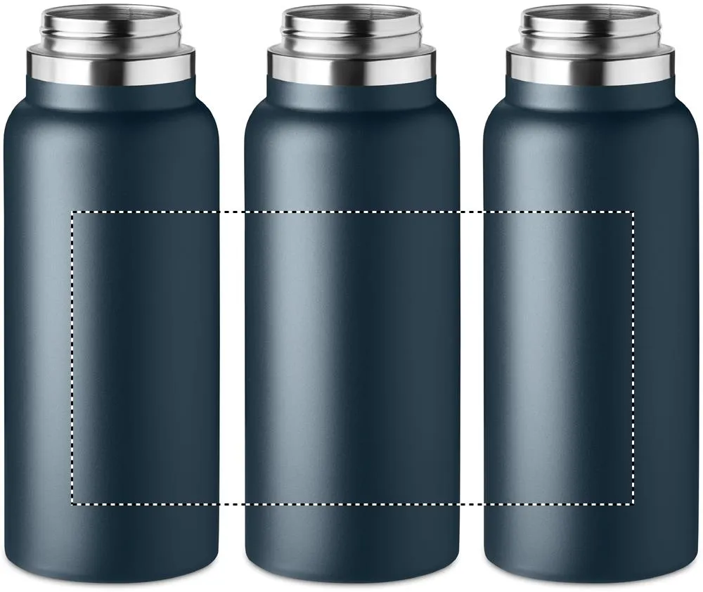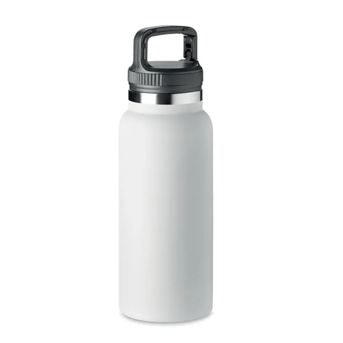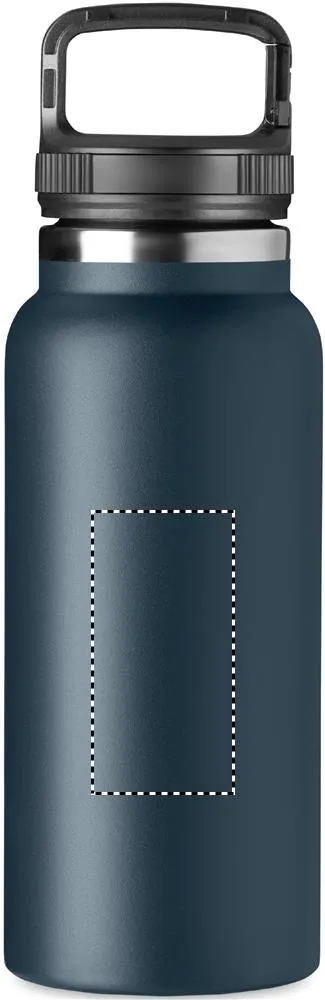 Garrafa isolada a vácuo de parede dupla de aço inoxidável com cabide na tampa. Capacidade: 970 ml.Garrafa de parede dupla 970 ml