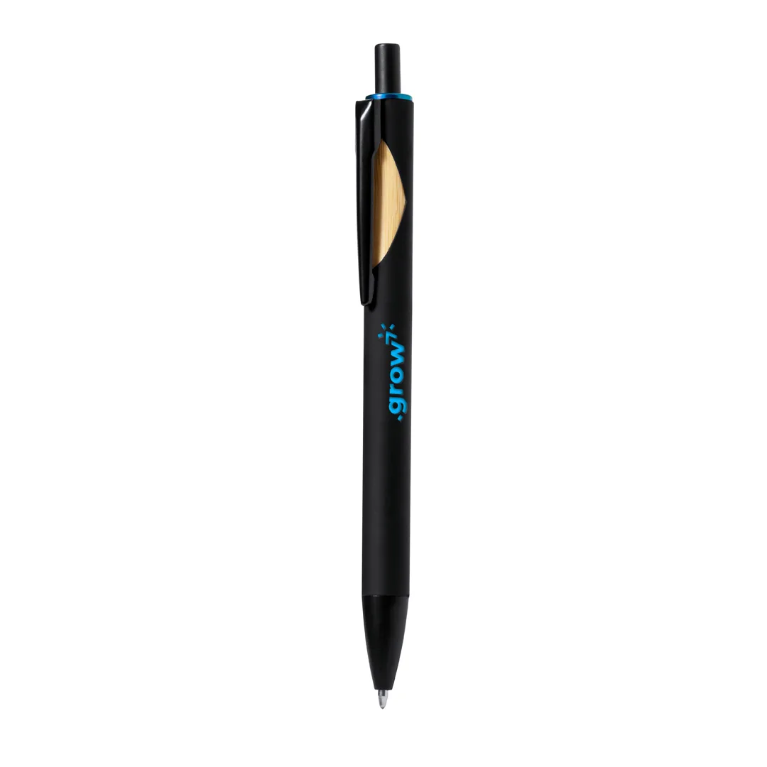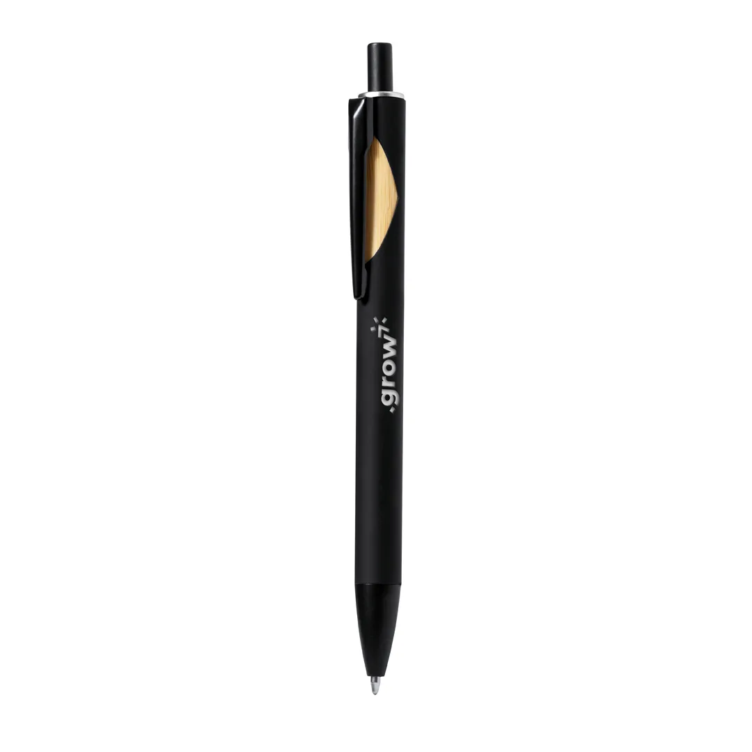 Esferográfica de mecanismo pulsador com corpo de acabamento sólido na cor preta e pormenor superior numa variada gama de cores. Clip metálico na cor preta com pormenor em bambu. Especialmente concebida para gravação a laser e com um revestimento exterior especial para que a sua publicidade fique perfeitamente gravada e a condizer. Em tinta azul. Apresentada numa bolsa individual reciclada.Materiais como o bambu promovem a utilização de matérias-primas naturais, reduzindo as emissões poluentes. Provém de uma planta de grande resistência e versatilidade, com crescimento e regeneração rápidos, o que o torna uma excelente alternativa à utilização da madeira tradicional.Alumínio/ Bambu