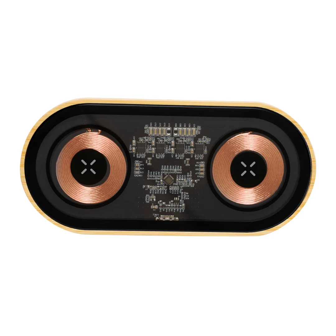 Carregador sem fios duplo de 15 W com desenho original e superfície transparente que permite ver os componentes internos do aparelho. Com base em bambu, compatível com dispositivos com tecnologia Qi, e que também permite carregar dois dispositivos em simultâneo. Conexão Tipo C, com instruções de uso em espanhol e inglês. Apresentado em caixa individual de design kraft.Materiais como o bambu incentivam o uso de matérias-primas naturais, reduzindo as emissões poluentes. Provém de uma planta de grande resistência e versatilidade, com rápido crescimento e regeneração, sendo uma excelente alternativa à utilização da madeira tradicional.Fabricado de acordo com os padrões RoHS e em conformidade com os seguintes requisitos de segurança:Sistema de proteção contra sobreaquecimento.Sistema de proteção contra sobrecarga.Sistema de bloqueio para evitar curto-circuitos.BambuSem Fios 15W
