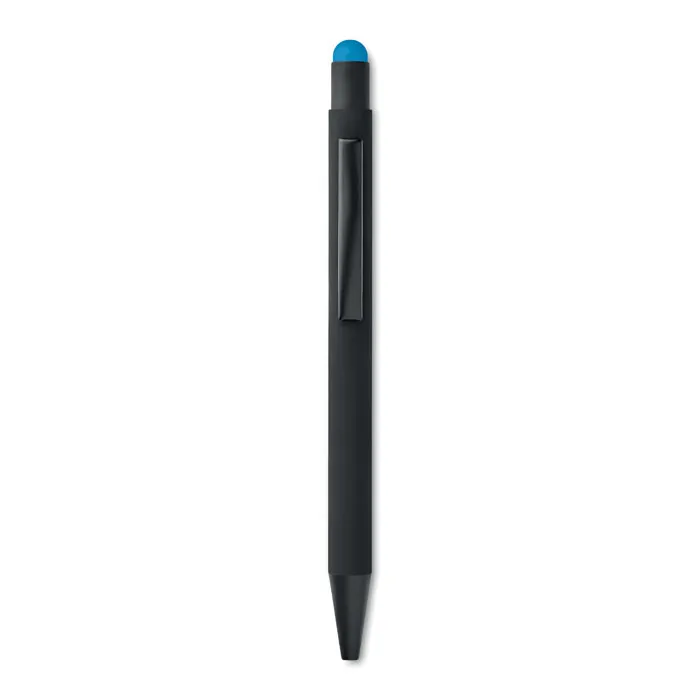 Caneta Stylus de botão em alumínio. Debaixo da capa preta do corpo, é da cor do botão, uma vez impresso em laser.Tinta azul.Caneta Stylus em alumínio