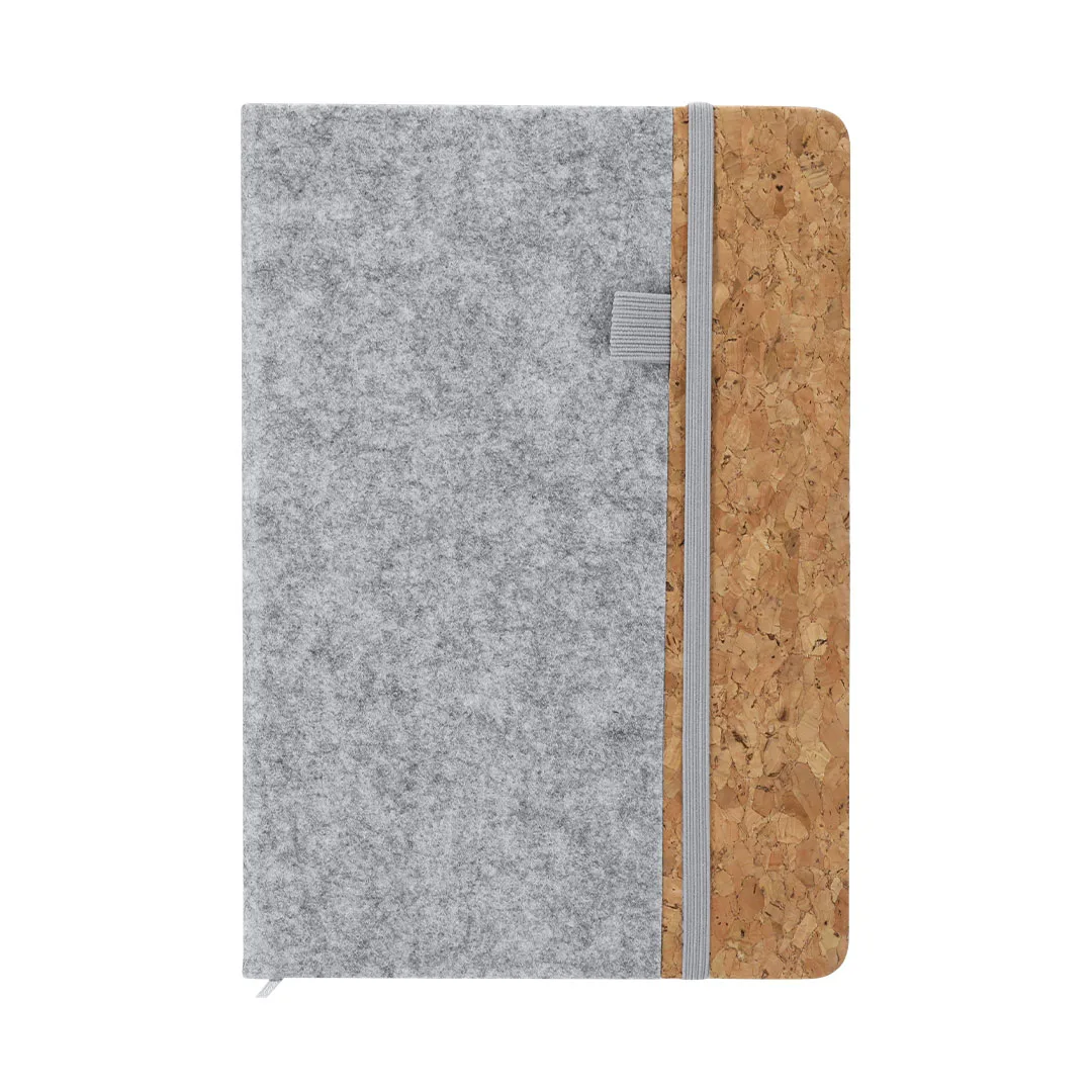 Bloco de notas com capas rígidas elaboradas em combinação de feltro RPET e cortiça. Inclui 80 folhas pautadas com elástico para prender canetas na capa, banda elástica de fechamento e marcador de páginas combinando. Inclui distintivo RFELT.Elaborado com elementos vegetais para promover a utilização de matérias-primas naturais e reduzir as emissões poluentes.O feltro RPET é fruto da combinação do processo de reciclagem de materiais plásticos com a técnica milenar de fabricação de feltro, resultando em um material de eco-tendência que, além de ser de origem reciclada, também se torna reciclável.Feltro RPET/ CortiçaCapa Rígida. 80 Folhas