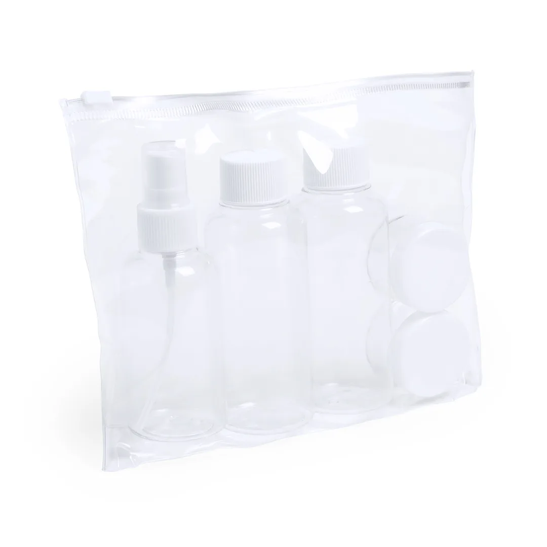 Necesire de viagem com 5 acessórios de design transparente. Inclui duas garrafas para gel e champõ com tampa de rosca, vaporizador e 2 caixas para creme. Apresentado num estojo de PVC com fecho hermético.PVC/ PP5 Acessórios
