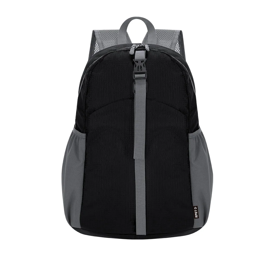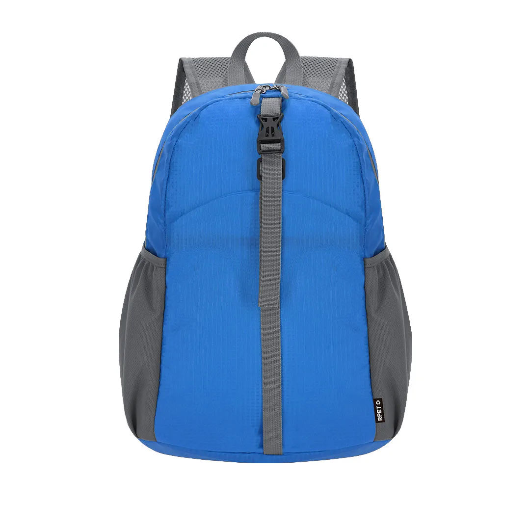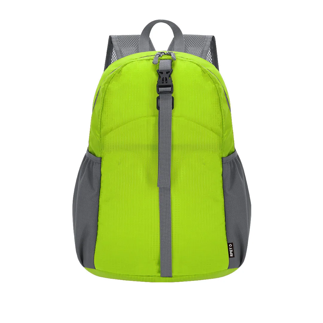 Mochila dobrável em suave poliéster Ripstop RPET 210D. Bolsinho principal com fecho de dois puxadores, bolso interior de dupla função e bolso frontal com fecho de clip. Cantos reforçados com redes, fitas de ombro reguláveis e acessórios em cor cinza. Dobre-se para um tamanho pequeno, com alça de transporte. Distintivo RPET na etiqueta.O material RPET é feito a partir de plástico reciclado, promovendo a reutilização de resíduos plásticos e ajudando à sustentabilidade do planeta.Ripstop RPET
