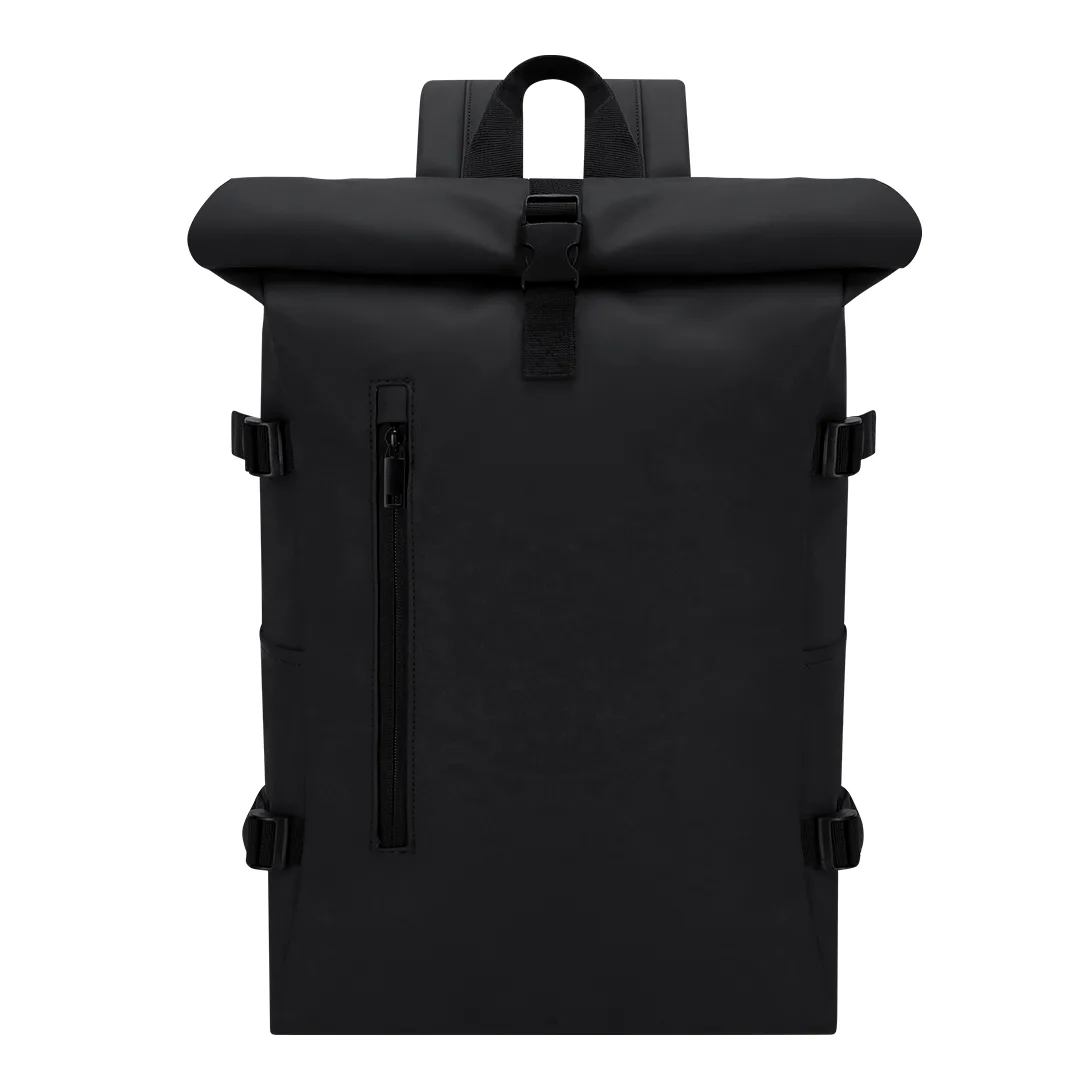 Mochila confeccionada em suave PU com sistema de fecho enrolável com fecho de correr e fivela. Dispõe de um bolso frontal e um bolso traseiro com acesso lateral, ambos com fechos invisíveis, além de dois bolsos laterais adicionais. Interior espaçoso com compartimento acolchoado para computador portátil até 15 polegadas. Alças laterais ajustáveis que permitem compactar o volume conforme necessário. Alças de ombro em PU e costas almofadadas para maior conforto. Correia peitoral com fivela para um ajuste seguro. Inclui fita traseira para fixação em trolley ou mala, ideal para viagens e deslocações.PUBolso Acolchoado para Portátil. Parte Traseira e Alças Acolchoadas