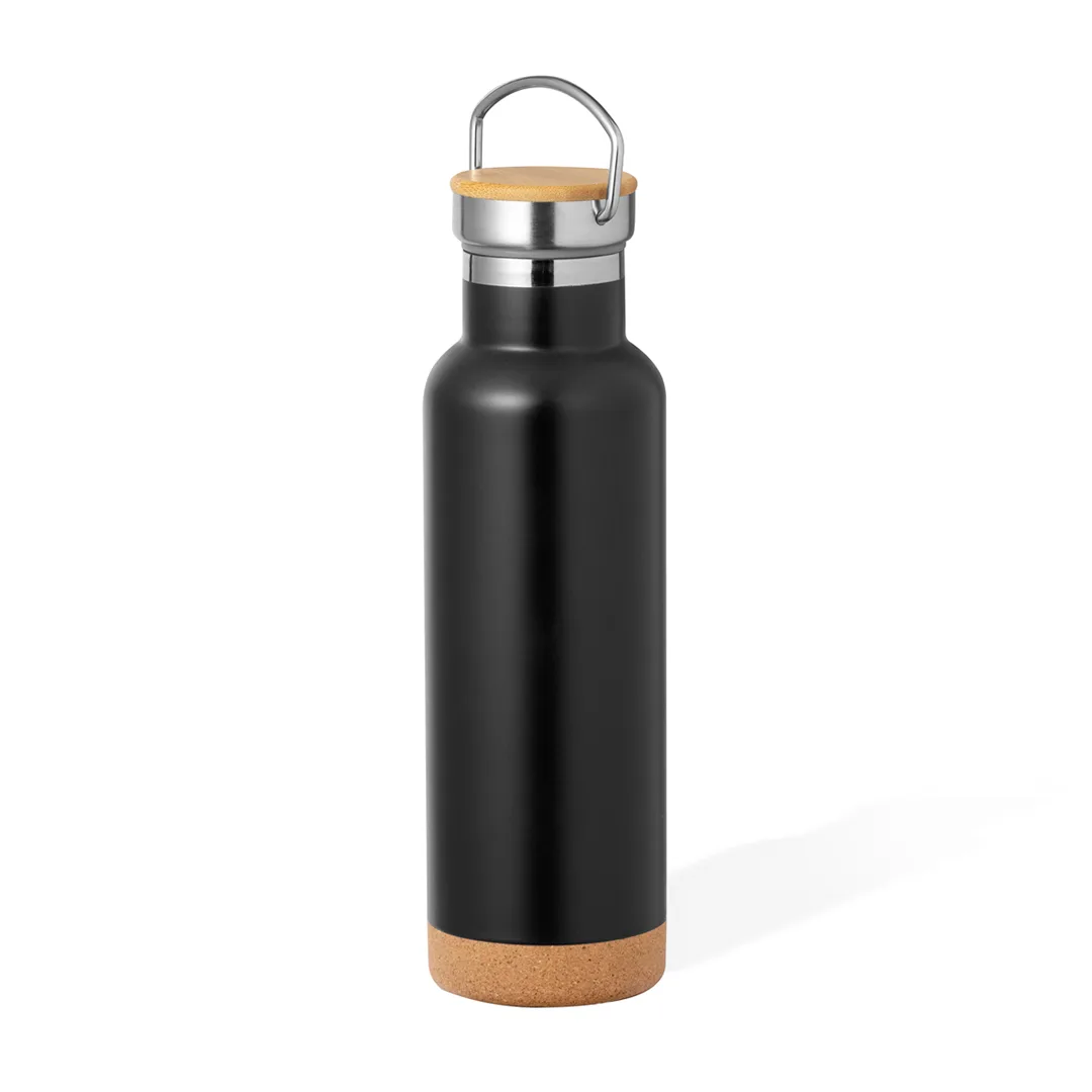Garrafa térmica de 650 ml de capacidade, fabricada em aço inoxidável de dupla parede. Inclui original tampa de rosca em aço inoxidável, com detalhe de bambu e asa integrada, e com original base de cortiça. Disponível numa variada gama de cores e apresentada numa caixa individual de design kraft.Aço Inox/ Cortiça/ Bambu650 ml