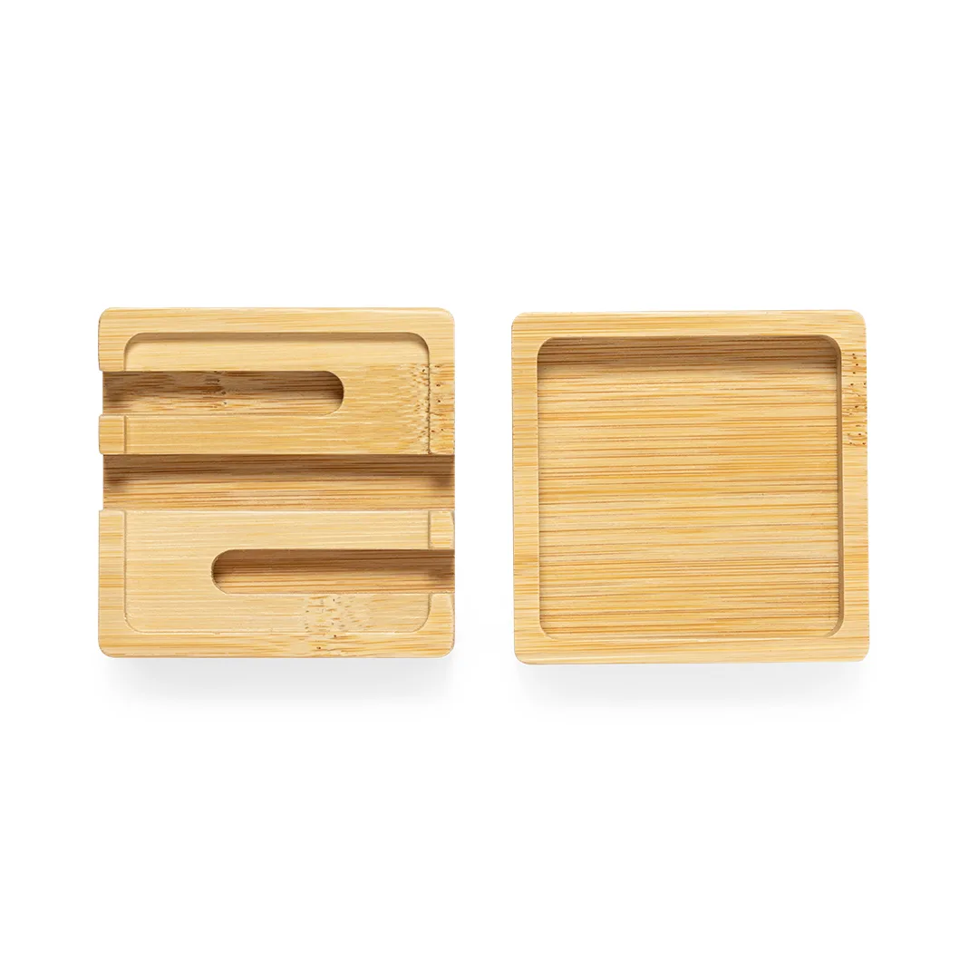 Prático organizador de mesa fabricado em bambu, que confere um estilo moderno e funcional à mesa. Com base prática para guardar objetos como clips ou notas adesivas, e parte superior com suporte para cartões e suporte para dispositivos móveis. Apresentado em caixa de design kraft. Materiais como o bambu promovem a utilização de matérias-primas naturais, reduzindo as emissões poluentes. Provém de uma planta de grande resistência e versatilidade, com crescimento e regeneração rápidos, sendo uma excelente alternativa ao uso da madeira tradicional.Bambu