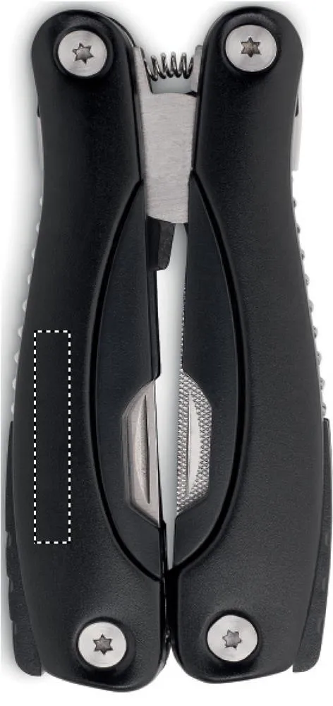 Faca multi usos dobrável em aço inoxidável. Inclui 9 ferramentas em ABS, e inclui tambem uma bolsa em Polyester 600D.Multikit