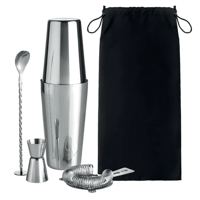 Conjunto de cocktail em aço inoxidável com agitador de 750 ml, jarro de medida (30 ml) e peneira em bolsa de algodão.Conjunto de cocktail de 750 ml