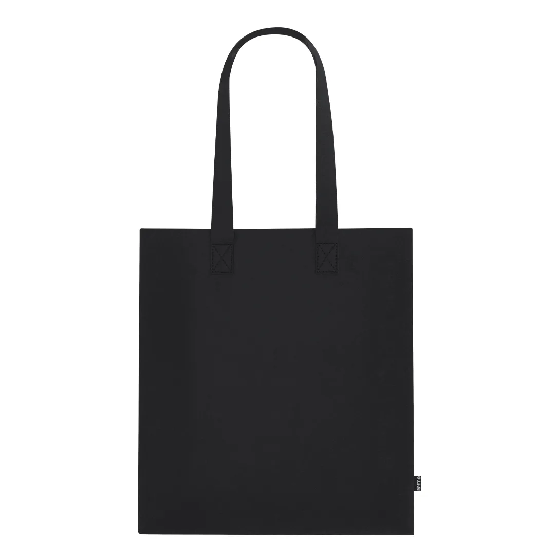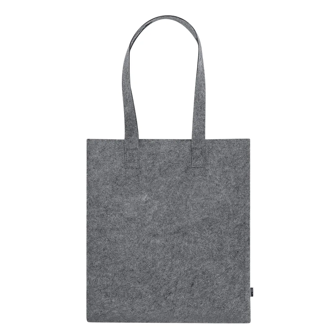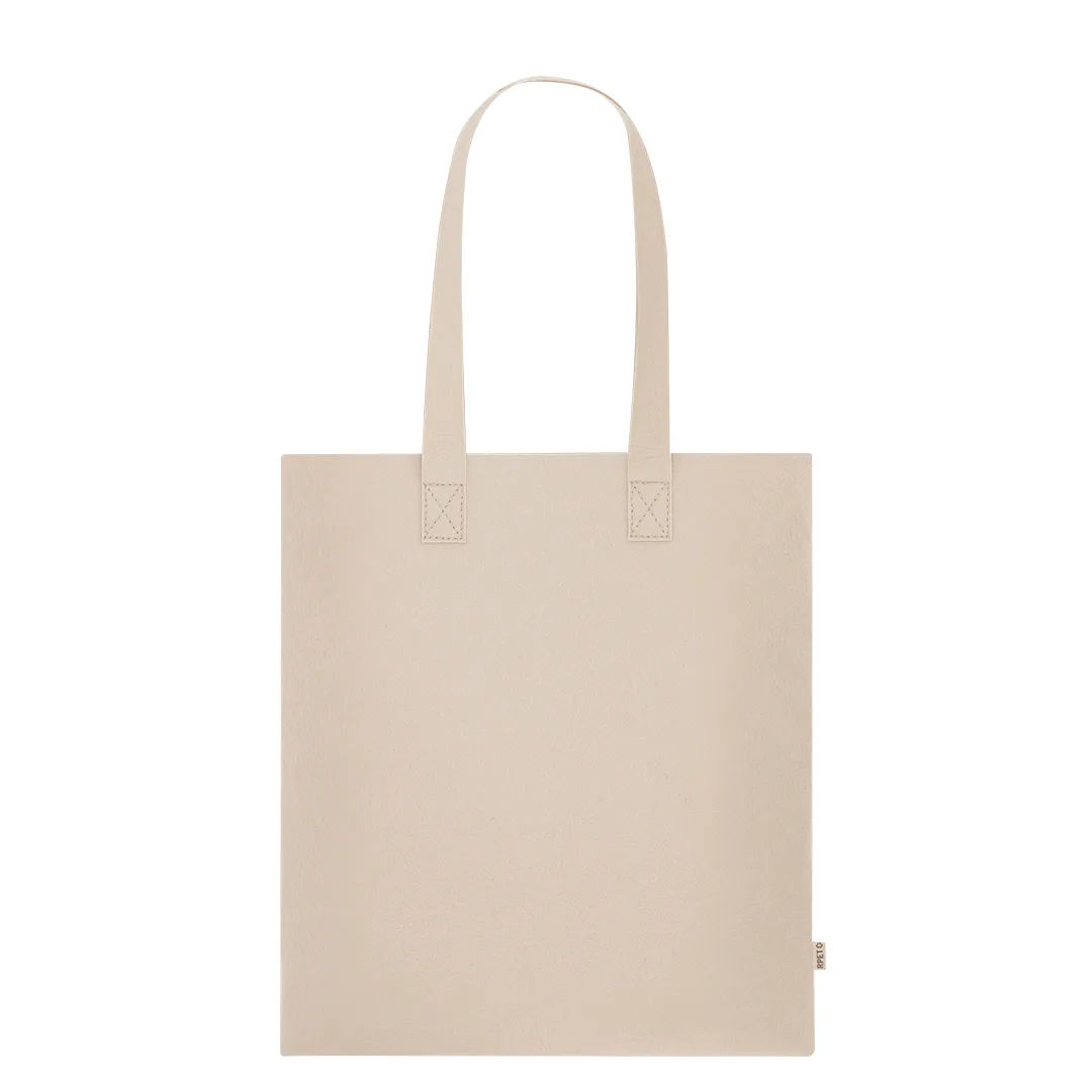 Bolsa fabricada em feltro RPET reciclado. Com alças longas e reforçadas. Resistência até 6kg. Inclui distintivo RPET na etiqueta exterior.O material RPET é elaborado a partir de plástico reciclado, para assim promover a reutilização de resíduos plásticos e ajudar à sustentabilidade do planeta.Feltro RPET