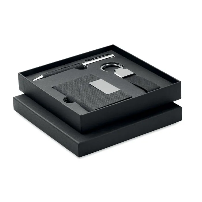 Conjunto de 3 peças em caixa de presente. Inclui uma caneta de metal com detalhe em poliéster RPET, um porta-chaves em poliéster RPET e um porta-cartões em poliéster RPET com placa de metal. Tinta azul.Conjunto de 3 peças em caixa