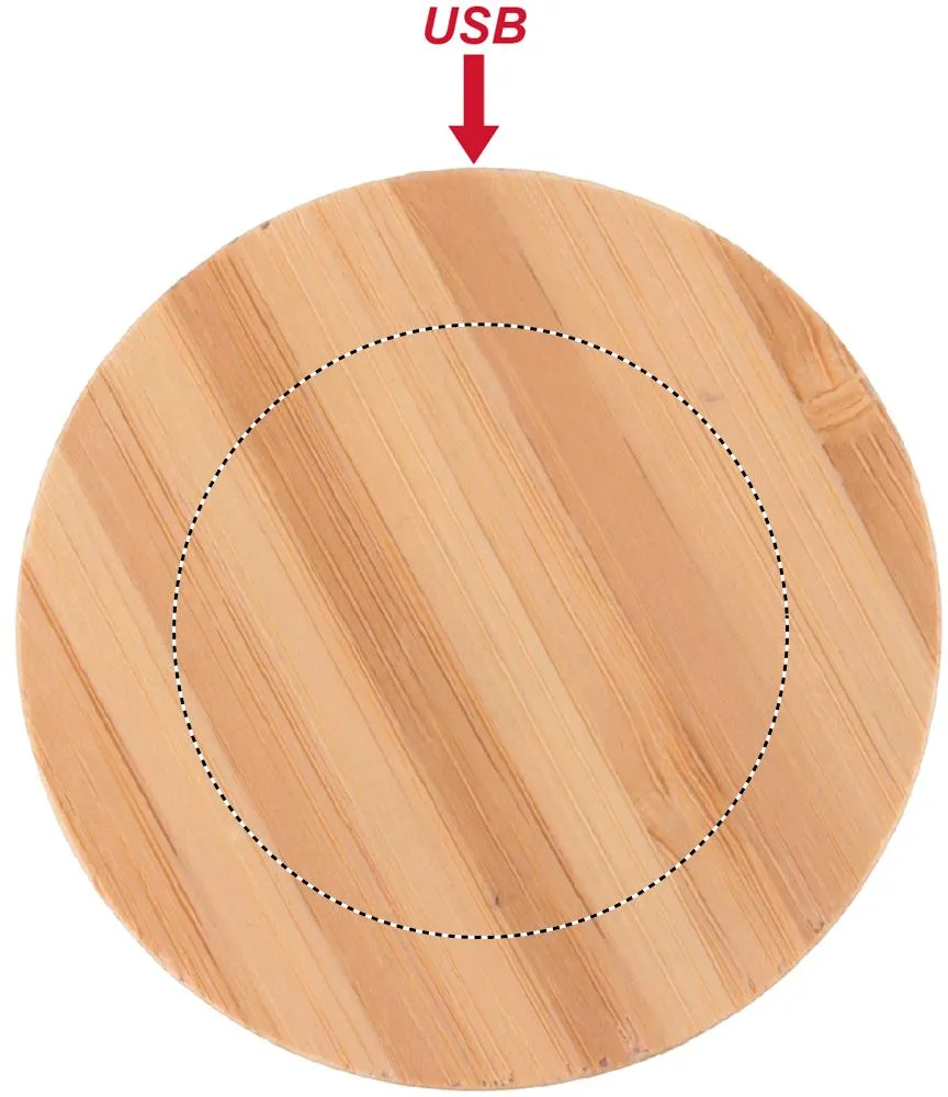 Carregador sem fios em bambu. Ligar o aparelho ao computador, colocar o smartphone sobre o mesmo e deixar a carregar. Luz azul durante o carregamento. Potência de saída: DC5V/1A (5W), O bambu é um material natural, a cor do item, o tamanho e a impressãCarregador sem fio em bambu