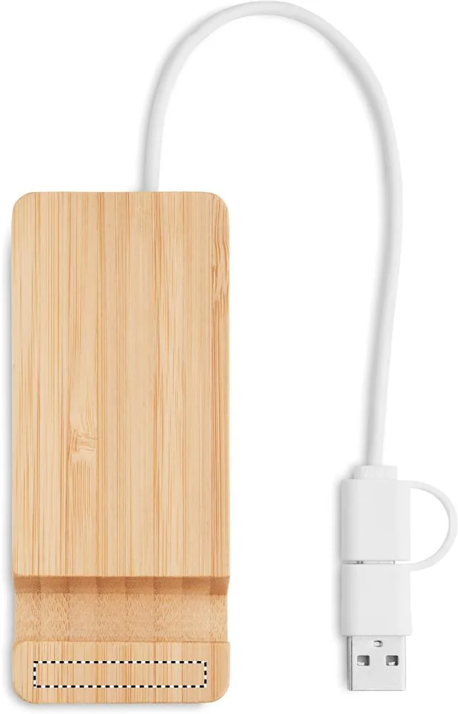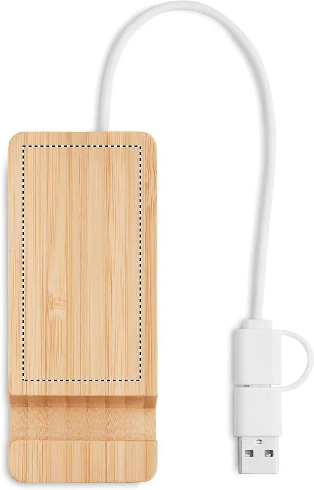 Hub USB-C/A de 4 portas em caixa de bambu. Saída: 2 x Tipo A e 2 x Tipo C. Entrada: 2 em 1 Tipo C e Tipo A. Comprimento do cabo: 20 cm.Hub 4 portas USB em bambu