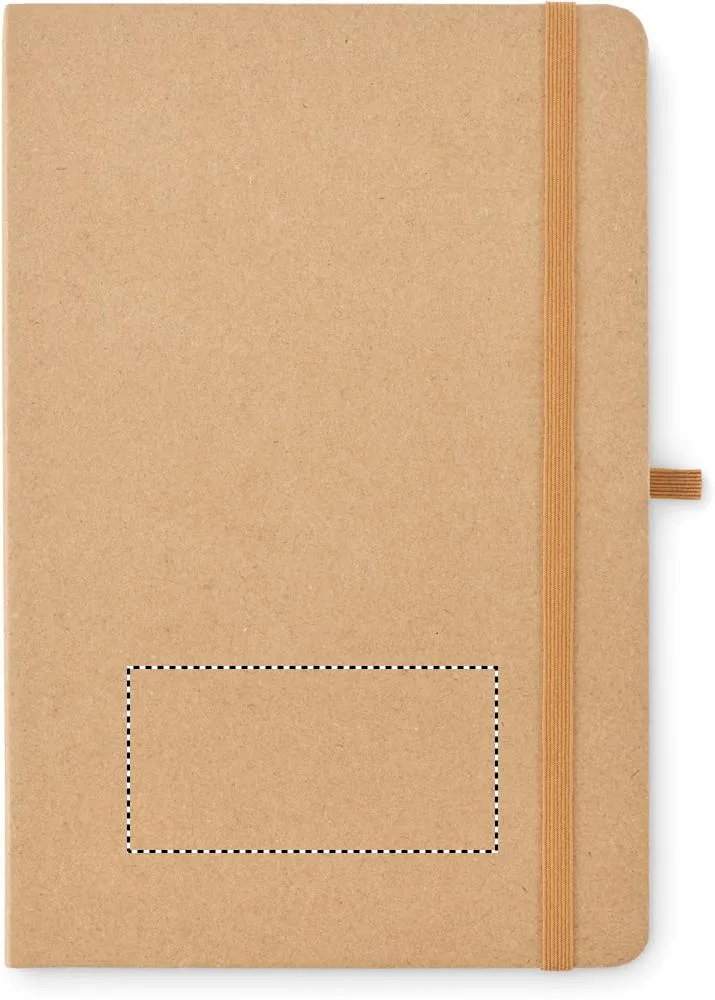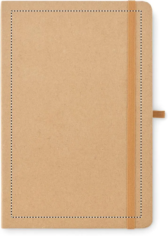 Bloco A5 com capa de cartão com 80 folhas de papel reciclado (160 páginas), 25 folhas de notas autocolantes e 25 blocos de notas. Fita elástica de fecho e porta canetas.Conjunto de papel reciclado A5