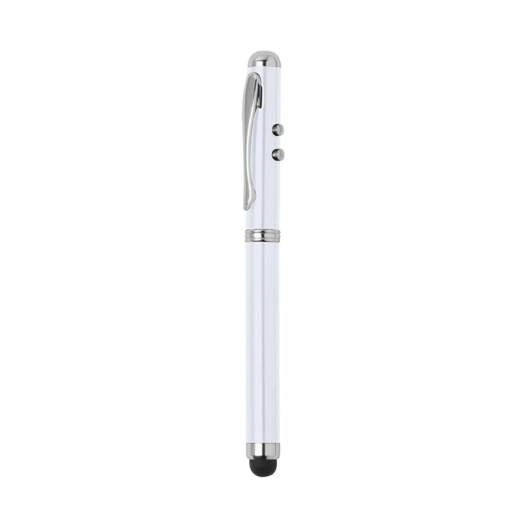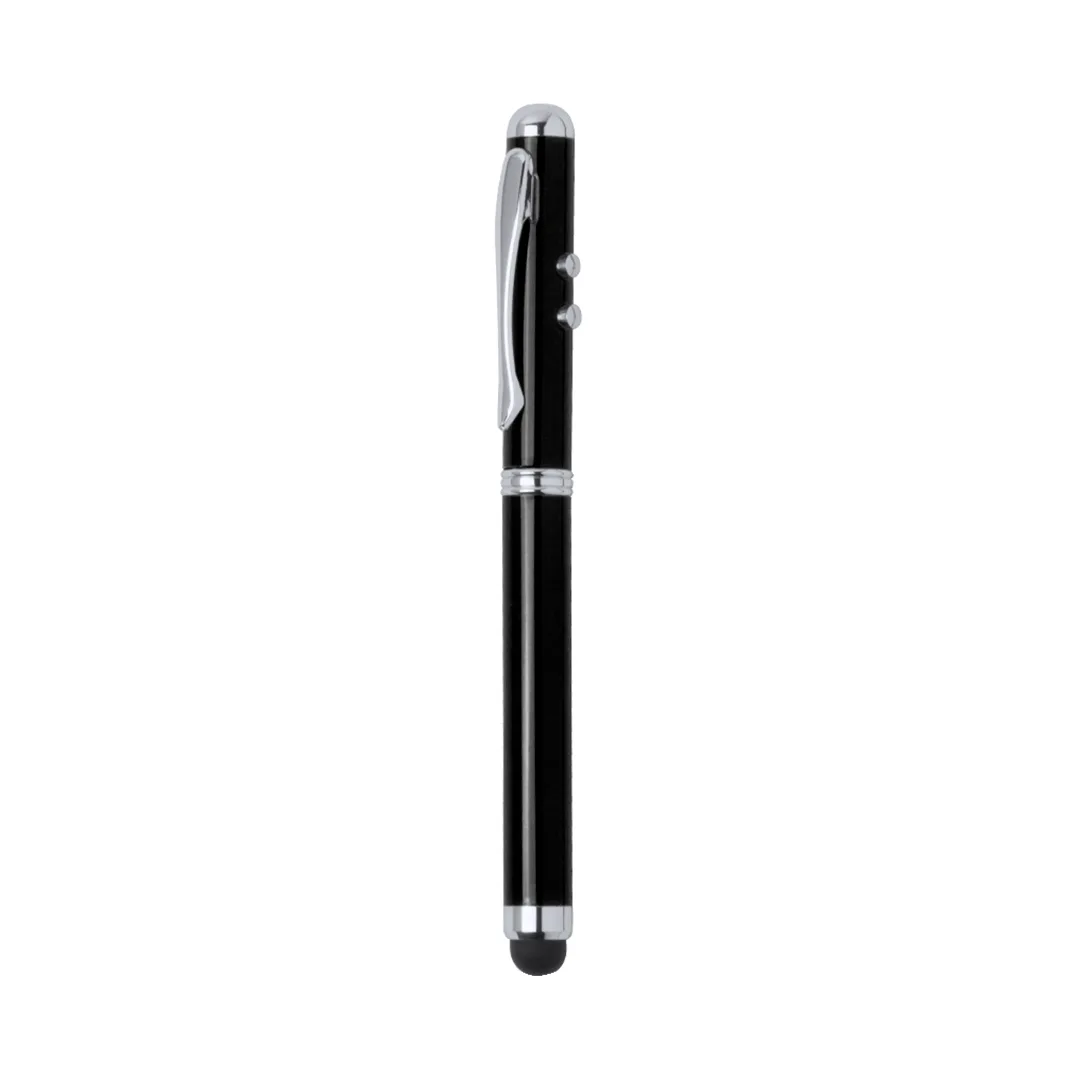 Esferográfica láser metálica em elegante acabamento brilho, com botões de activação laterais para funções láser e lanterna (pilhas de botão incluídas). Em tinta azul, com ponteiro tátil integrado, fecho de tampa e clip cromado. Especialmente desenhada para impressão a laser. Apresentada num elegante estojo metálico em caixa individual de cartão de acabamento prateado. Interior em suave esponja recortada, com pilhas suplentes.Metal1 Led. Pilhas Botão Incluídas