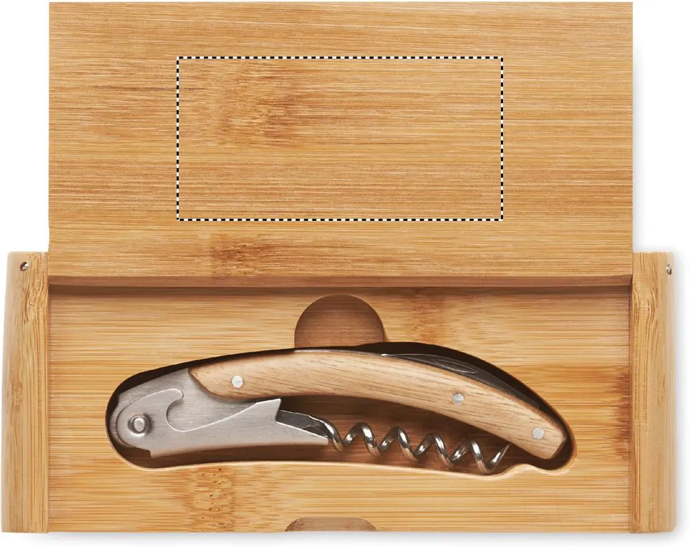 Faca de mesa original em aço inoxidável com saca-rolhas duplo e acabamento bambu. Apresentada numa caixa em bambu. O bambu é um material natural, a cor do item, o tamanho e a impressão podem variar.Faca em aço inoxidável e bambu