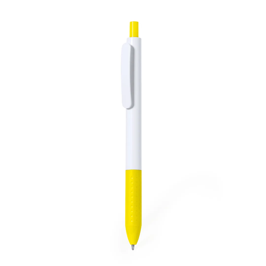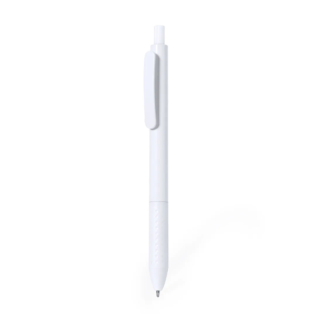 Esferográfica de mecanismo pulsador em resistente ABS. Fabricada numa elegante combinação de corpo e clip em tom branco. Com botão e cabo disponíveis numa vibrante variedade de cores. Em tinta azul.