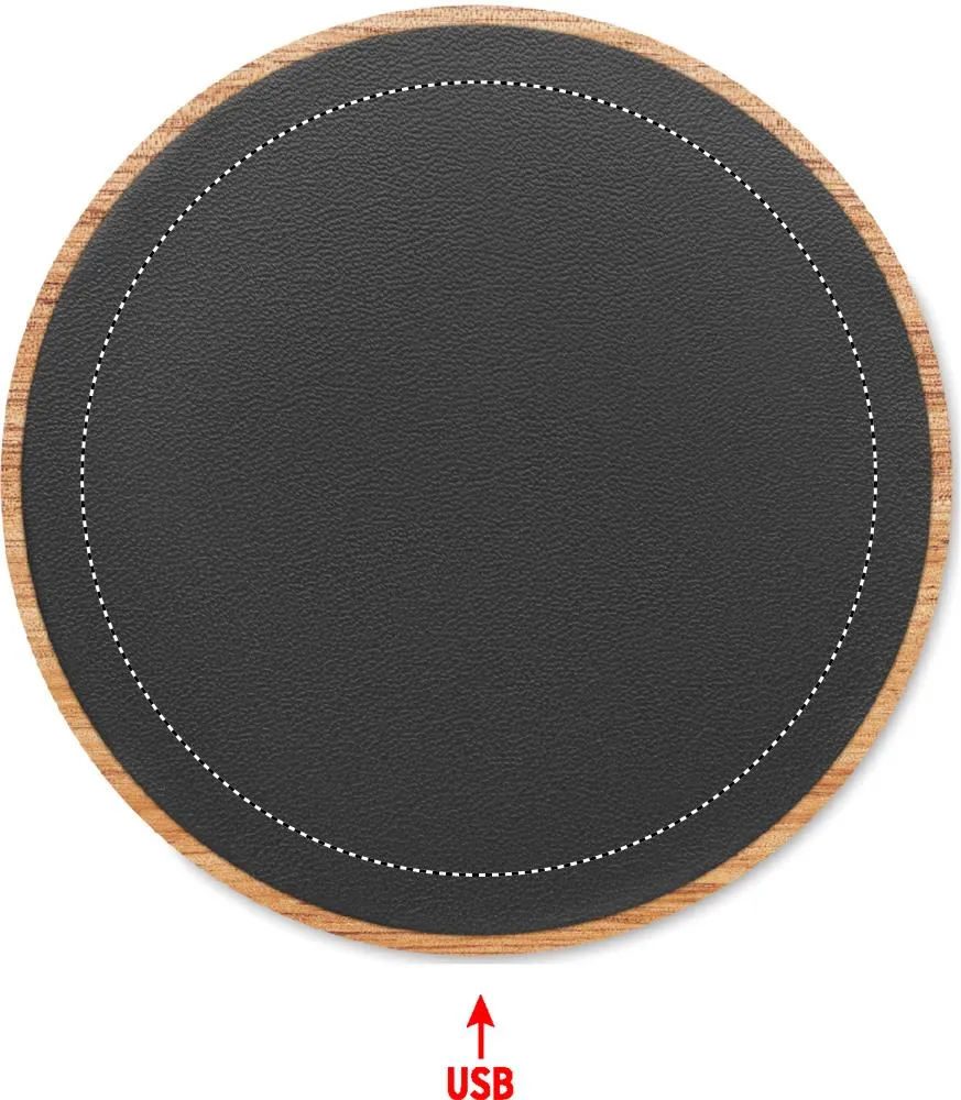 Carregador sem fios em madeira de acácia e 58% PU reciclado (40% poliéster reciclado e 18% PU reciclado). Saída: DC 9V/1,67A (15W). Compatível com todos os dispositivos compatíveis com QI, como os mais recentes Android, iPhone® 8, X e mais recentes.Carregador sem fios em acácia