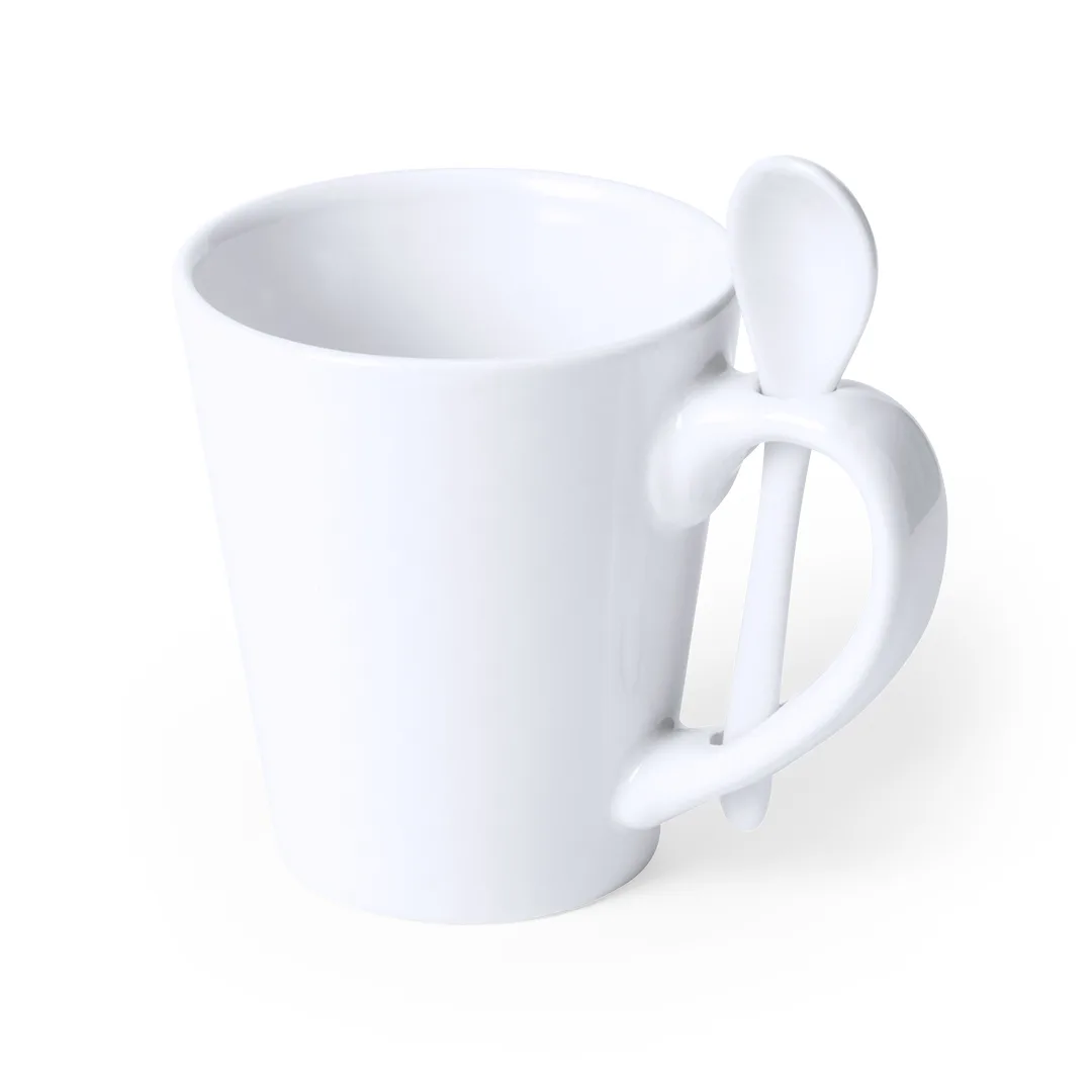 Caneca de cerâmica de 350 ml de capacidade na cor branca e com colher de cerâmica integrada na pega. Especialmente concebida para sublimação. Apresentada em caixa individual.Manual de instruções disponível em espanhol e inglês.Cerâmica350 ml