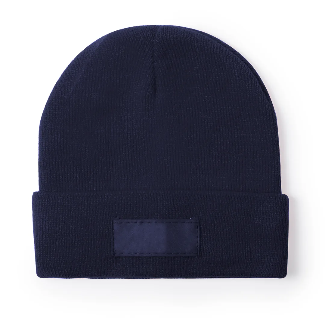 Gorro infantil macio e quente feito de material acrílico. Elástico e de fácil ajuste, com bainha combinando e etiqueta frontal para personalização.Acrílico
