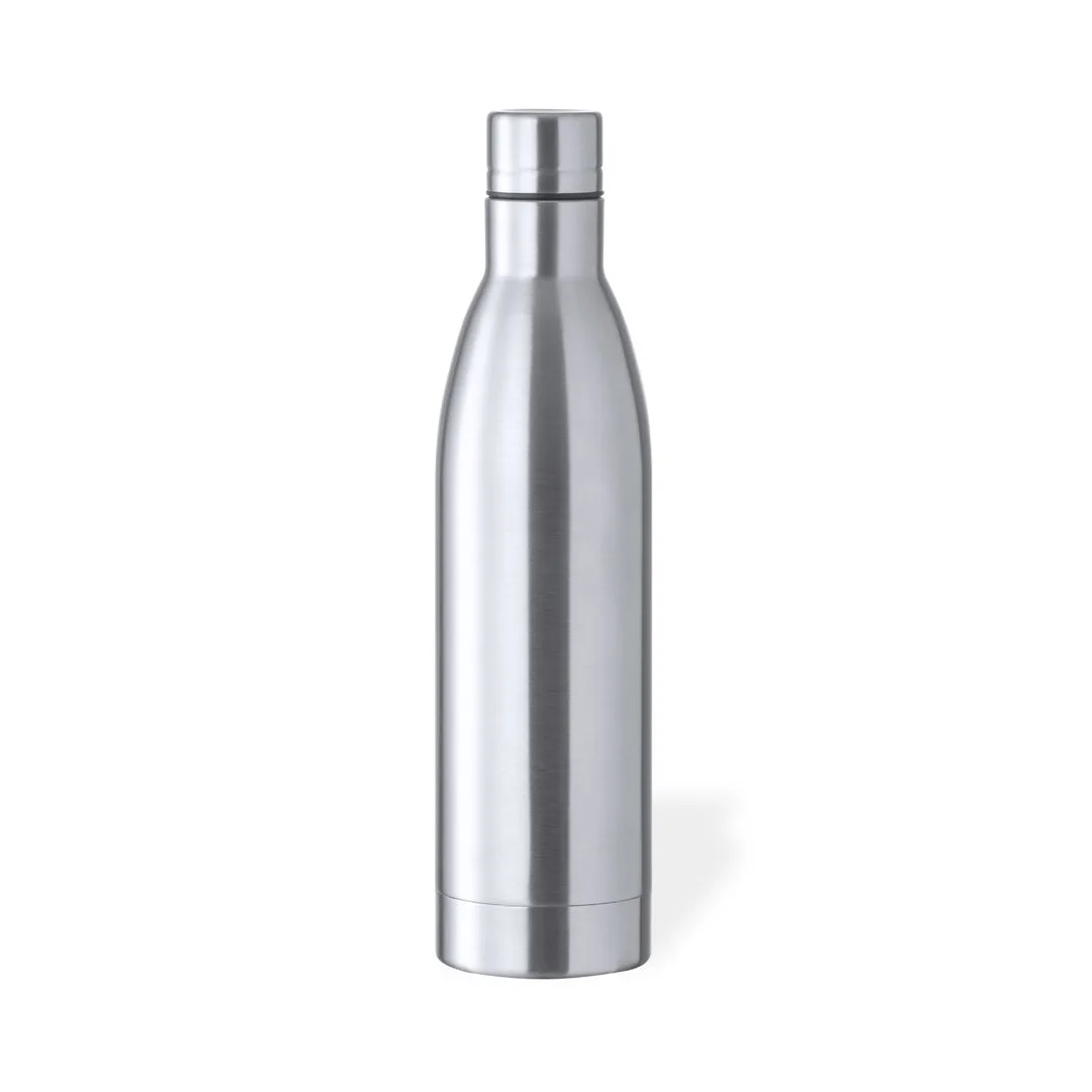 Garrafa de 1 l de capacidade, feita de aço inoxidável com acabamento brilhante. Com tampa de rosca de aço inoxidável correspondente, livre de BPA. Apresentado numa caixa de design kraft individual. Manual de instruções disponível em espanhol e inglês.Aço Inox1 L