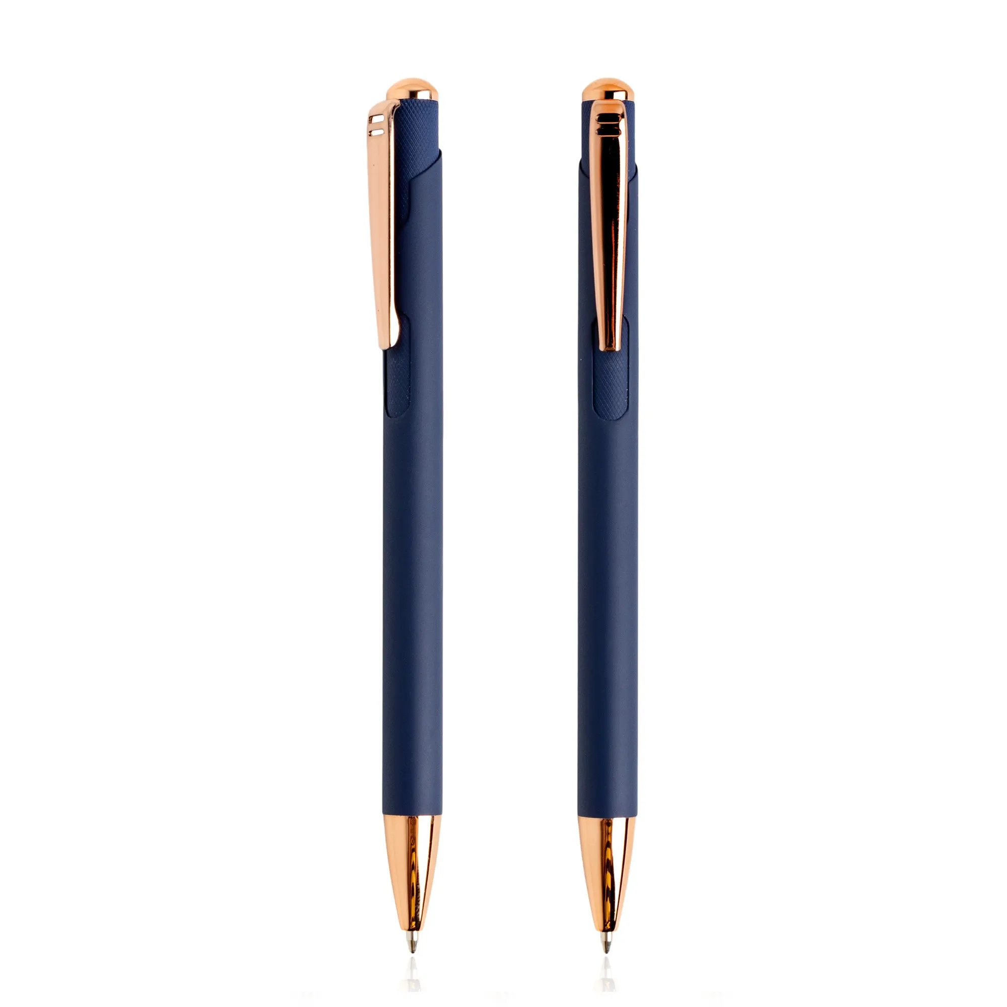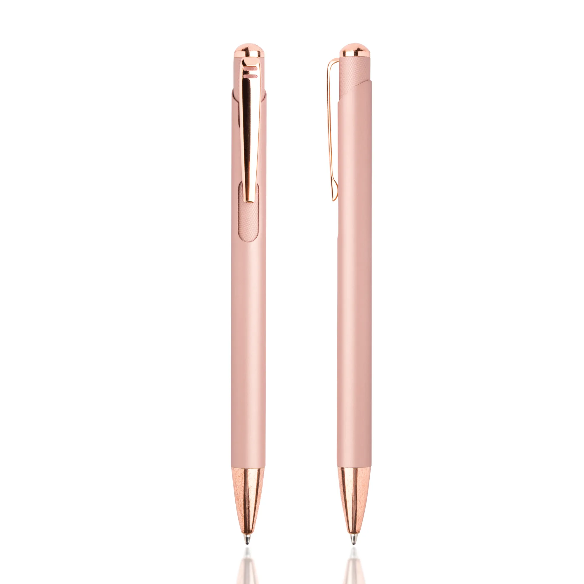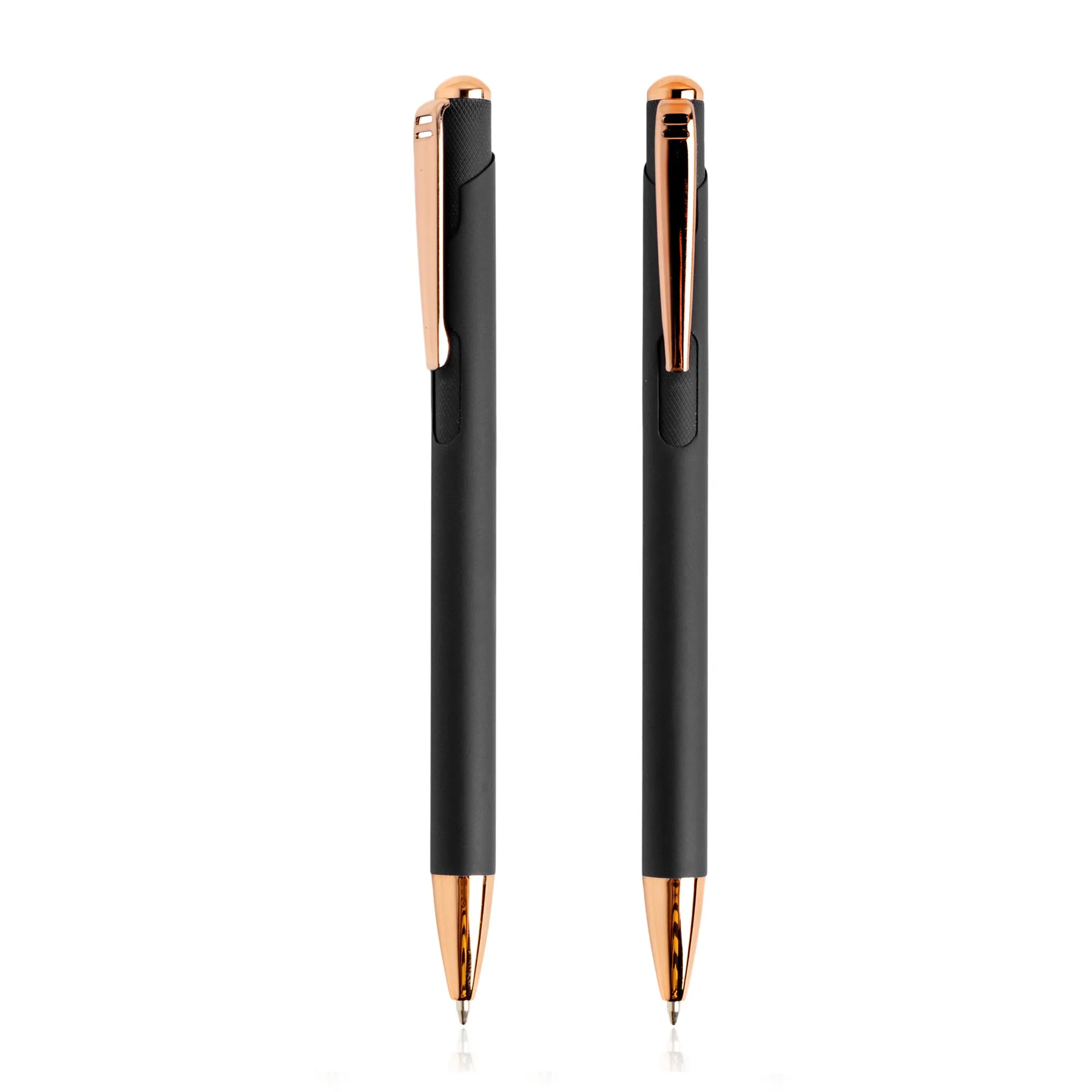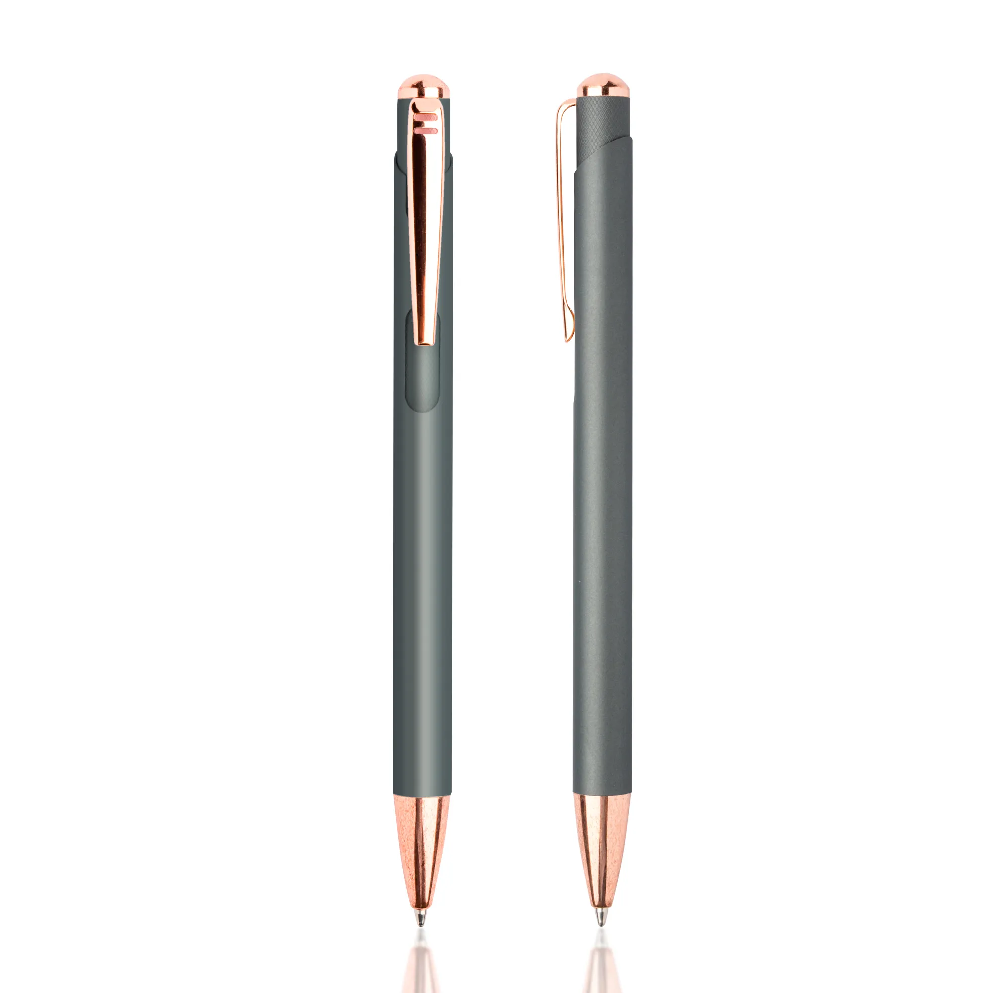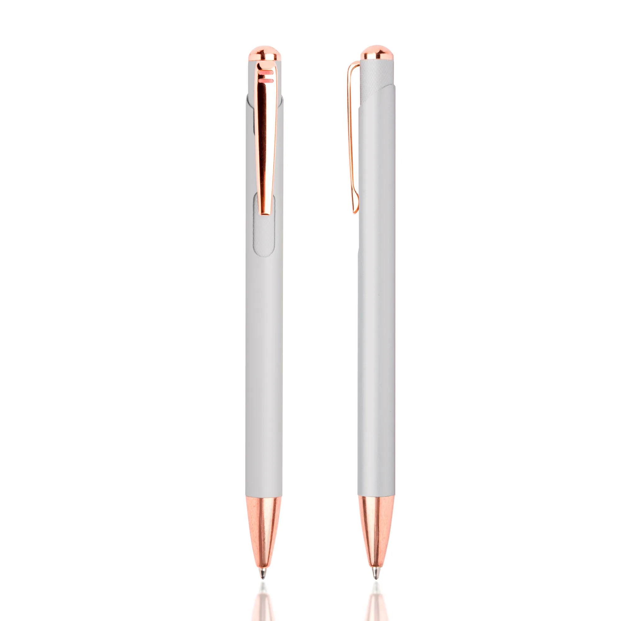 Esferográfica em metal, com detalhes rosa gold. Uma esferográfica feminina, com cores modernas e atrativas. Os detalhes rosa gold atribuem-lhe destaque e elegância. Na gravação a laser, o seu design ficará a combinar com os detalhes. Com sistema pulsar. Esta esferográfica é de escrita azul.Esferográfica em metal, com detalhes acobreados