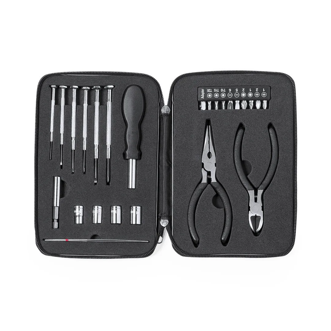 Conjunto de ferramentas de 25 acessórios num resistente estojo de alumínio com interior recortado em EVA. Inclui conjunto de chaves de fendas de precisão, ferramenta multifunção, pontas intercambiais,chaves de fendas plana e de estrela cabeças de tubo pinças e alicates. Apresentado em caixa individual.Alumínio25 Acessórios