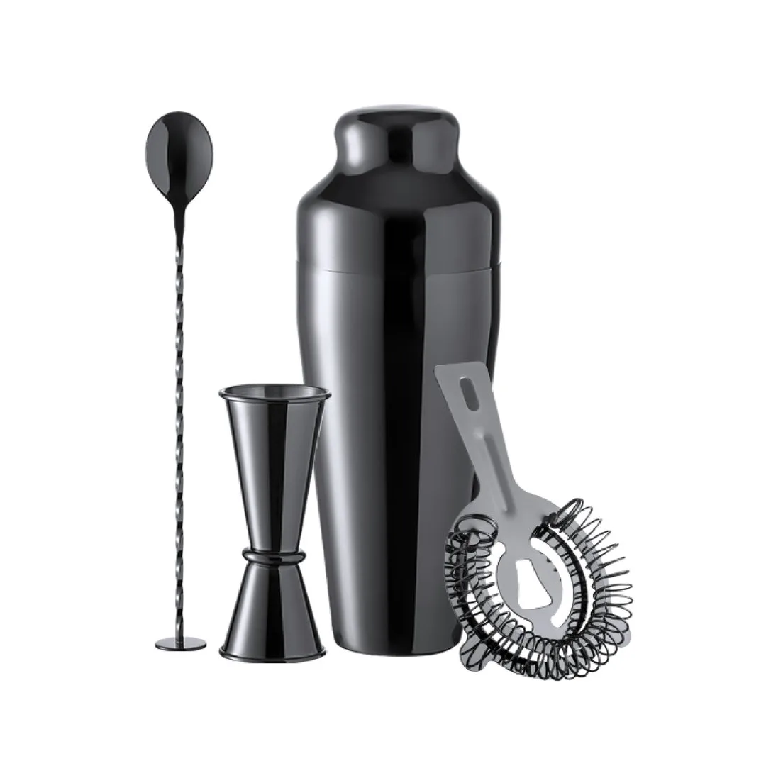 Completo conjunto de cocktail, de design exclusivo Limited Edition, fabricado em aço inox de elegante acabamento preto brilhante. Inclui: -Shaker de 550 ml de capacidade.-Copo medidor 2 em 1 de 25 e 50 ml.-Filtro.-Colher misturadora.Apresentado num estojo Limited Edition Experience, de design único e protegido por direitos de propriedade industrial. Incluída etiqueta de cartão reciclado com descrição Limited Edition.Da combinação perfeita entre a exclusividade e o design nasce Limited Edition, uma coleção especial de ideias promocionais de edição limitada. Um novo conceito, inspirado na fusão de artigos premium com as últimas tendências, em séries de unidades limitadas e oferecendo uma experiência de brinde única, exclusiva e inesquecível.Aço InoxShaker 550 ml. 4 Acessórios