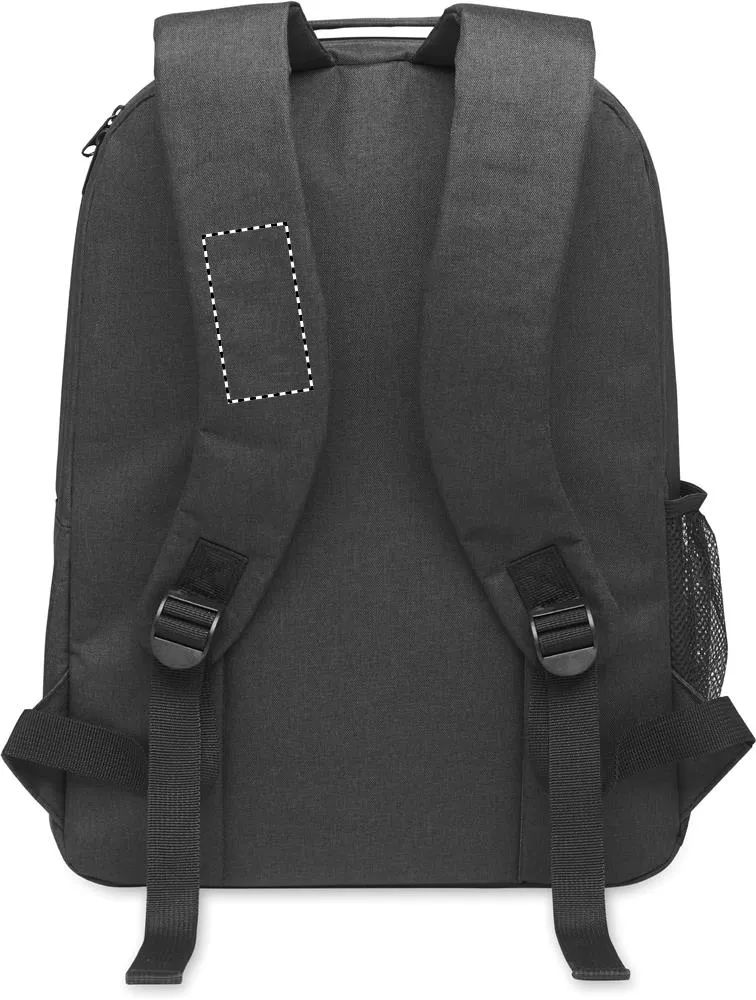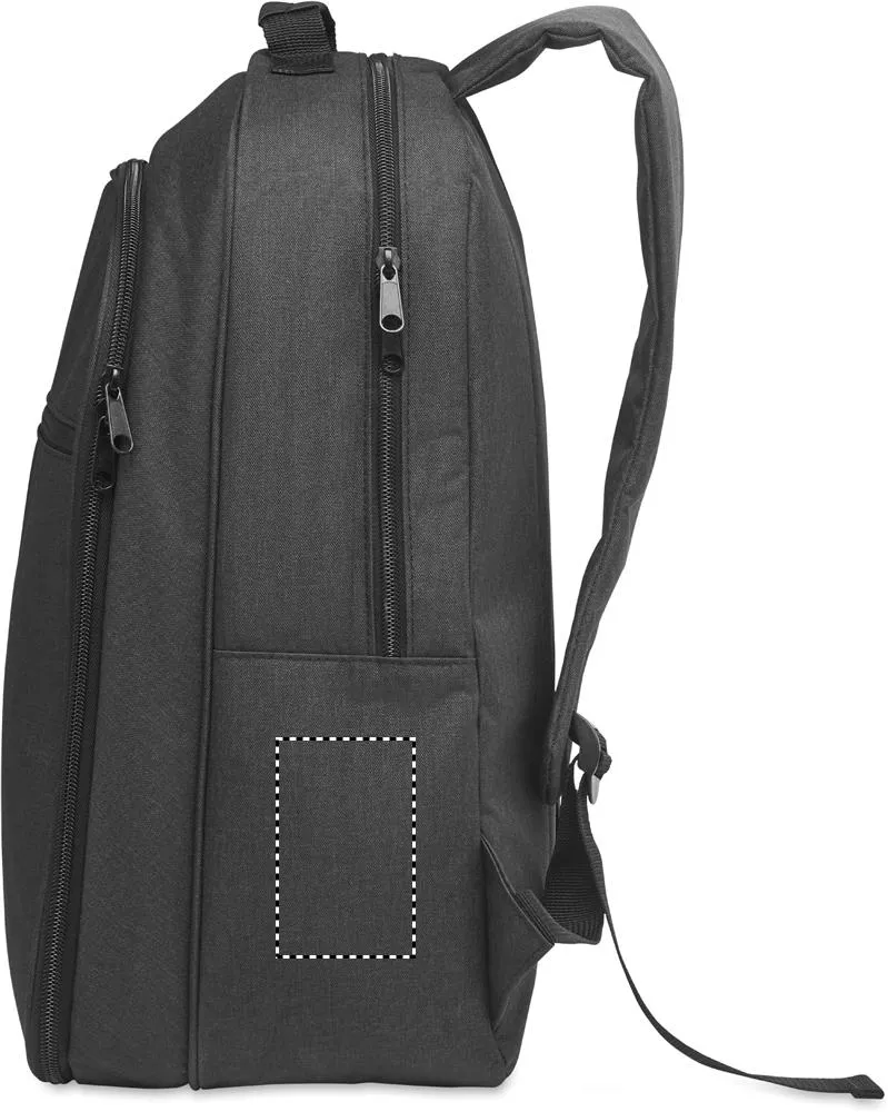 "Mochila em RPET 300D com compartimento para laptop de 15"" e compartimento para refrigerador. Bolso frontal com zíper e compartimento lateral de malha."Mochila RPET 300D laptop 15"