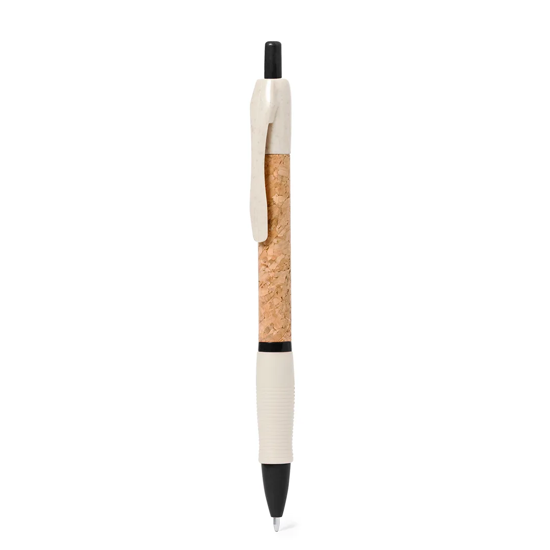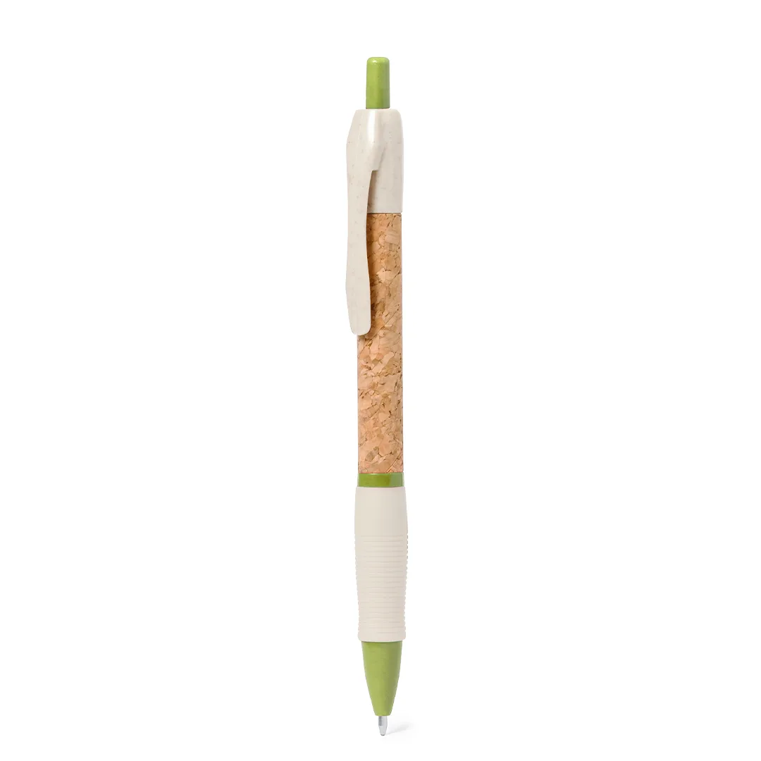 Esferográfica de mecanismo pulsador com corpo em cortiça natural. Clip, ponta e pulsador em palha de trigo. Disponível numa variada gama de cores. Distintivo Wheat Straw na parte superior da esferográfica. Em tinta azul.Elaborada com elementos vegetais, para assim fomentar a utilização de matérias-primas naturais e reduzir as emissões poluentes.Cortiça/ Palha de Trigo/ ABS