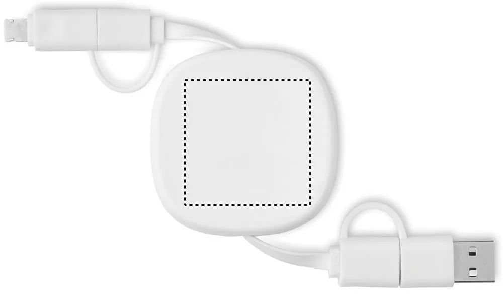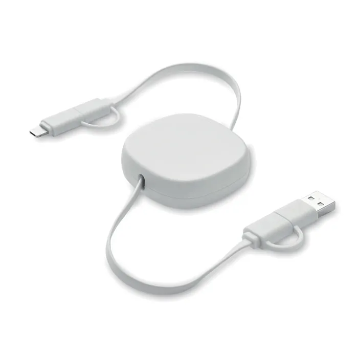 Cabo de carregamento retrátil de 60W. Caixa em ABS reciclado. Entrada: 2 em 1 Tipo C e Tipo A. Saída: Tipo C e micro-B (ficha 2 em 1). Comprimento do cabo: 80 cm.Conjunto de cabos retráteis