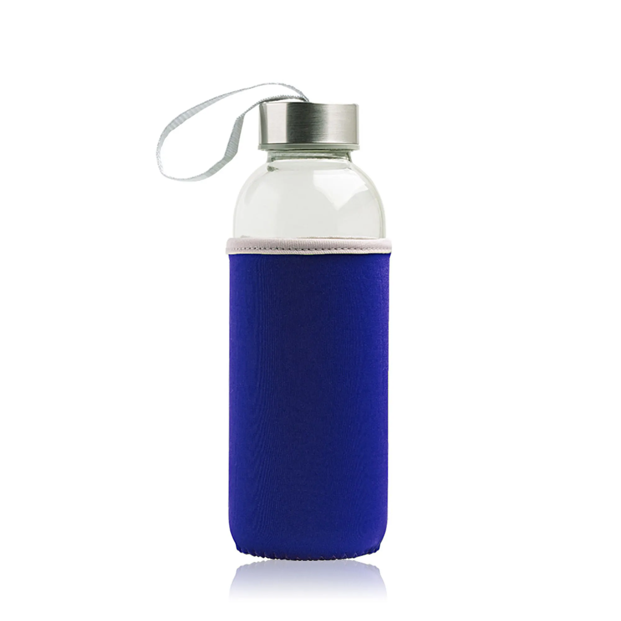 Garrafa em vidro 430ml, com tampa em metal e manga em neopreno. As garrafas de plástico não reutilizáveis estão cada vez mais démodé. A pensar nisso, e no meio ambiente, surge esta garrafa de vidro que pode usar quantas vezes quiser. Com tampa em metal e atilho. A manga em neopreno é ótima para tornar esta garrafa numa personalização única e especial.Garrafa em vidro, com tampa em metal e manga em neopreno