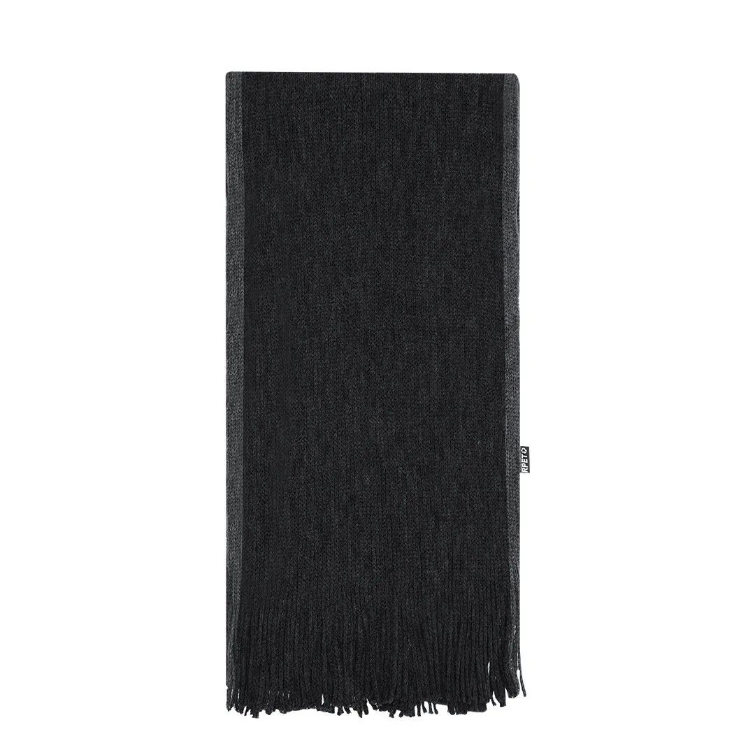 Macio e quente cachecol confecionado em poliéster RPET . Fabricado em elegantes cores bicolores com rebordos de cores diferentes e acabamento em franjas. Com o logotipo RPET na etiqueta. Apresentada individualmente numa caixa preta. O material RPET é fabricado a partir de plástico reciclado, a fim de promover a reutilização de resíduos de plástico e ajudar à sustentabilidade do planeta.Poliéster RPET