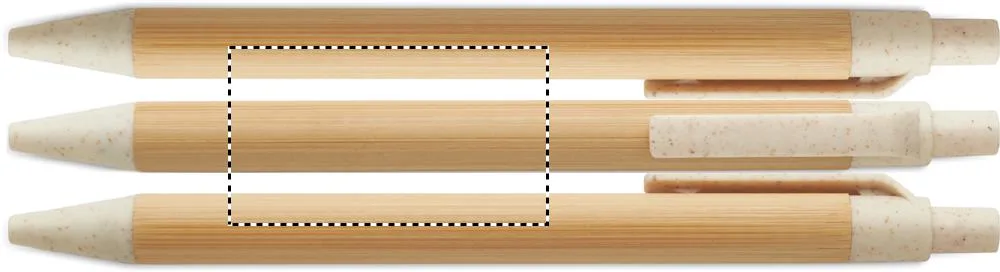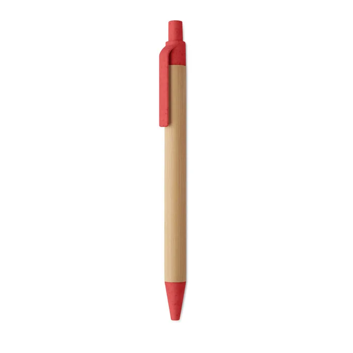 Esferográfica com botão de pressão com corpo em bambu e acessórios em palha de trigo (50%) e plástico ABS (50%). Tinta azul.Caneta de pressão em bambu