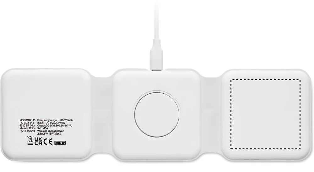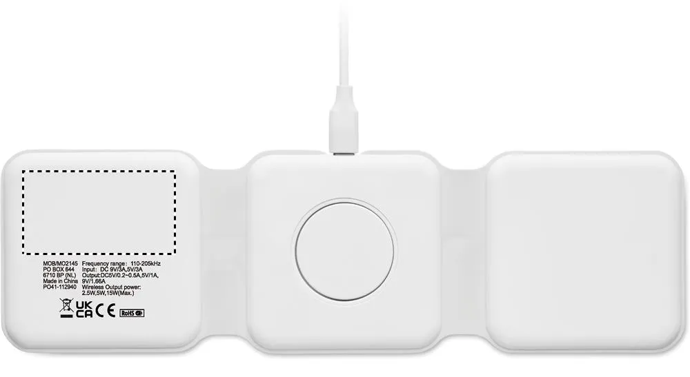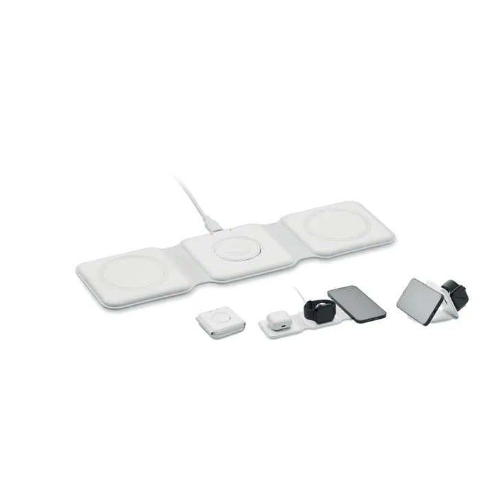 Base de carregamento dobrável 3 em 1 em ABS. Inclui 3 pontos de carregamento sem fios (15 W). Entrada: 2 em 1 Tipo C e Tipo A. Compatível com todos os dispositivos compatíveis com QI, como os mais recentes Androids, iPhone® 8, X e mais recentes. Também compatível com o iWatch.Base de carregamento dobrável
