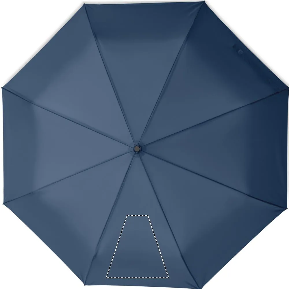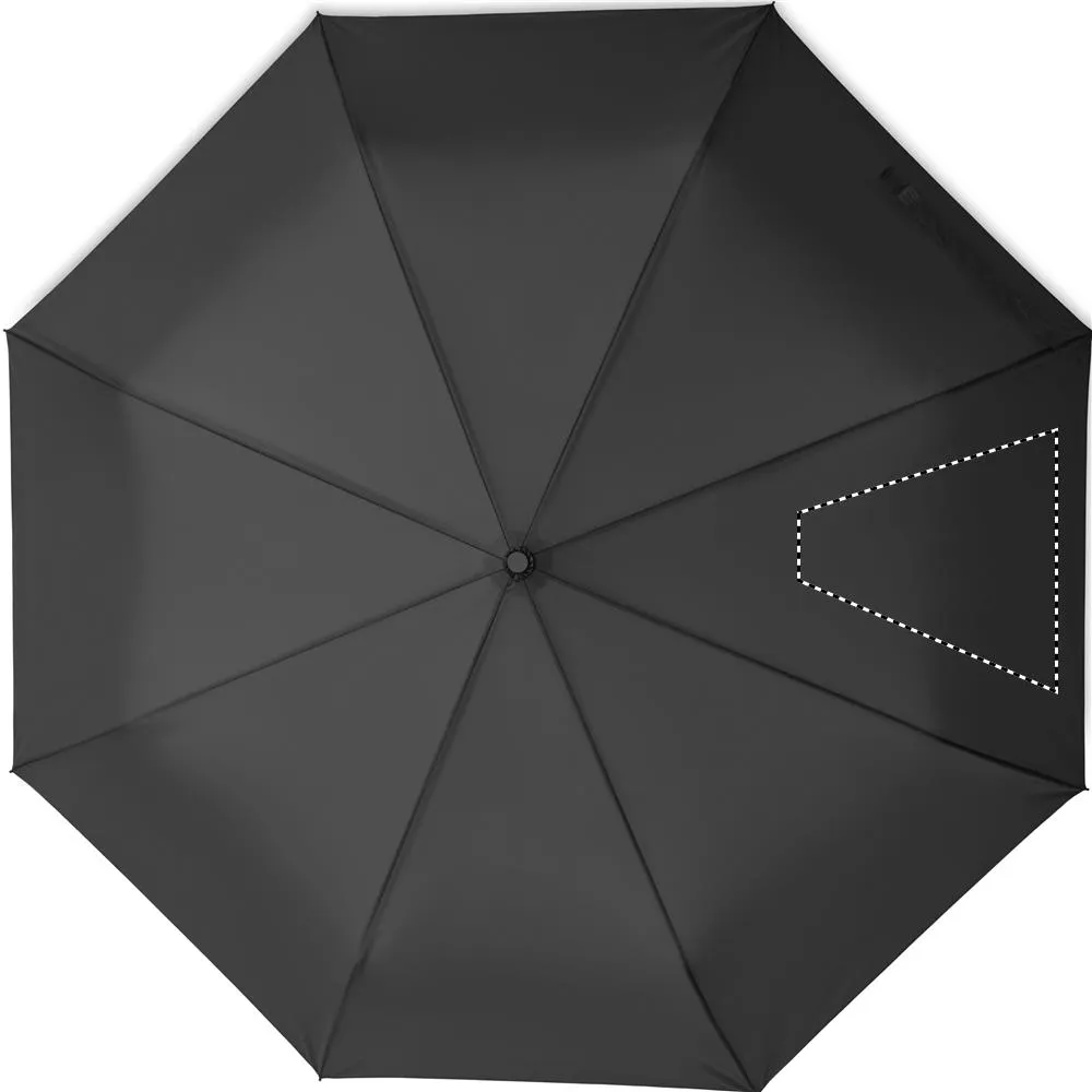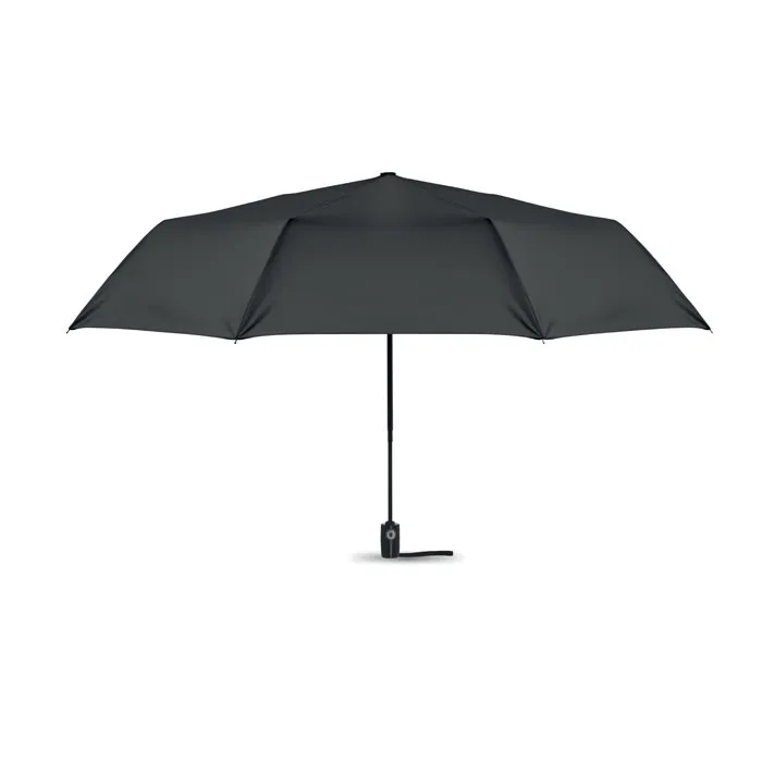 Guarda-chuva de 27'' de 3 dobras auto aberto/fechado à prova de vento. Feito em 190T pongee e veio em aço chapeado a preto. Varetas em fibra de vidro. Cabo PP preto com botão. Com bolsa a condizer.Guarda-chuva de 27"