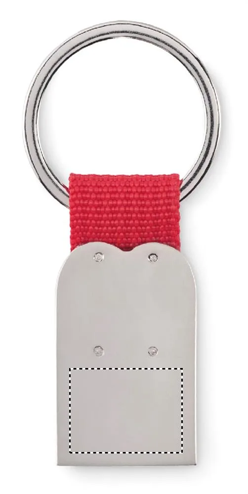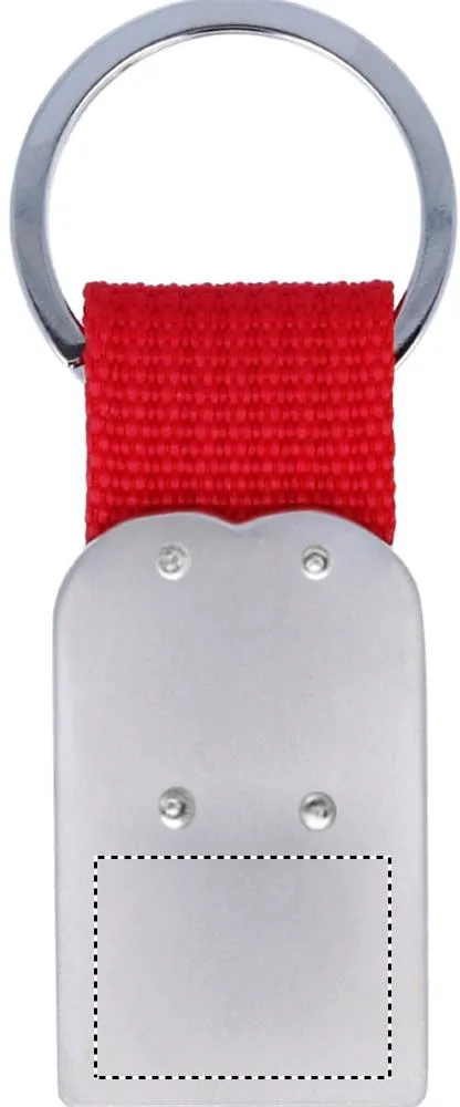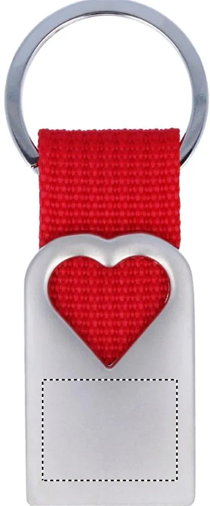 Porta-chaves de metal acabamento com efeito perola mate, com decoração em forma de coração e uma tira de cor vermelha em poliéster. Apresentado numa caixa individual.Porta-chaves em forma coração