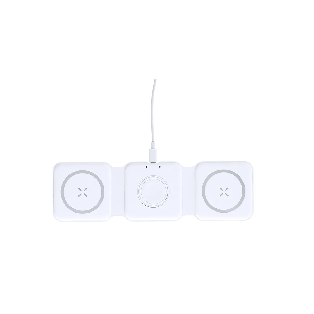 Carregador sem fio magnético completo 15W, projetado para carregamento simultâneo de smartphone, fones de ouvido e smartwatch. Um gadget tudo-em-um: dobrável, portátil, compacto, muito versátil e funcional no design. Conexão via USB Tipo C -cabo incluído- e feito de ABS resistente na cor branca.Fabricado de acordo com os padrões RoHS e em conformidade com os seguintes requisitos de segurança:Sistema de proteção contra superaquecimento.Sistema de proteção contra sobrecarga.Sistema de bloqueio para evitar curtos-circuitos.Sem Fios 15W. Magnético
