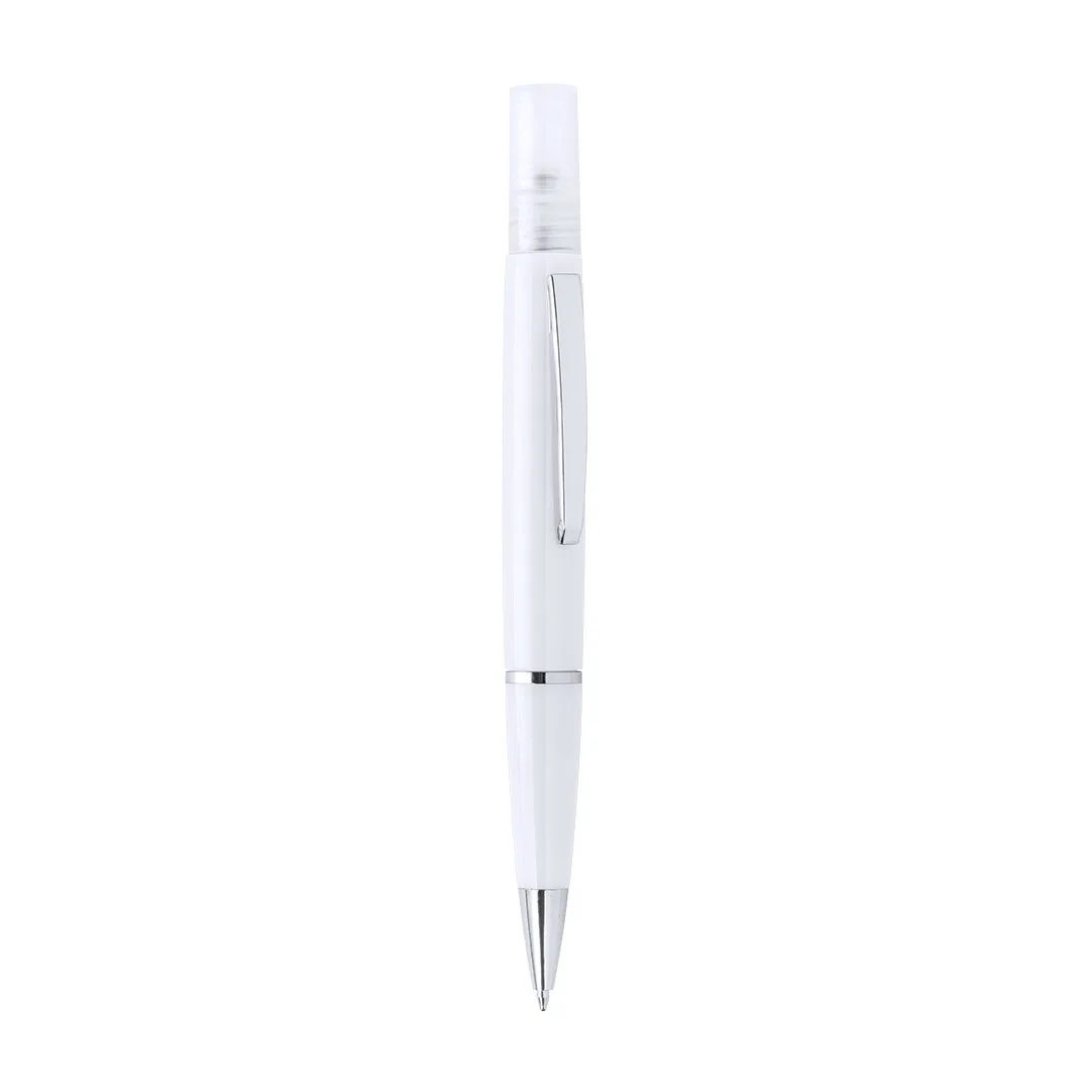 Esferográfica higienizante com pulverizador regarregável integrado e tampa protectora. Acabamento em resistente ABS brilhante com elegante clip metálico e cómoda pega e escrita a azul. Capacidade do pulverizador 3 ml. Líquido não incluído. Disponível numa ampla e vasta gama de cores.3 ml. Líquido Não Incluído