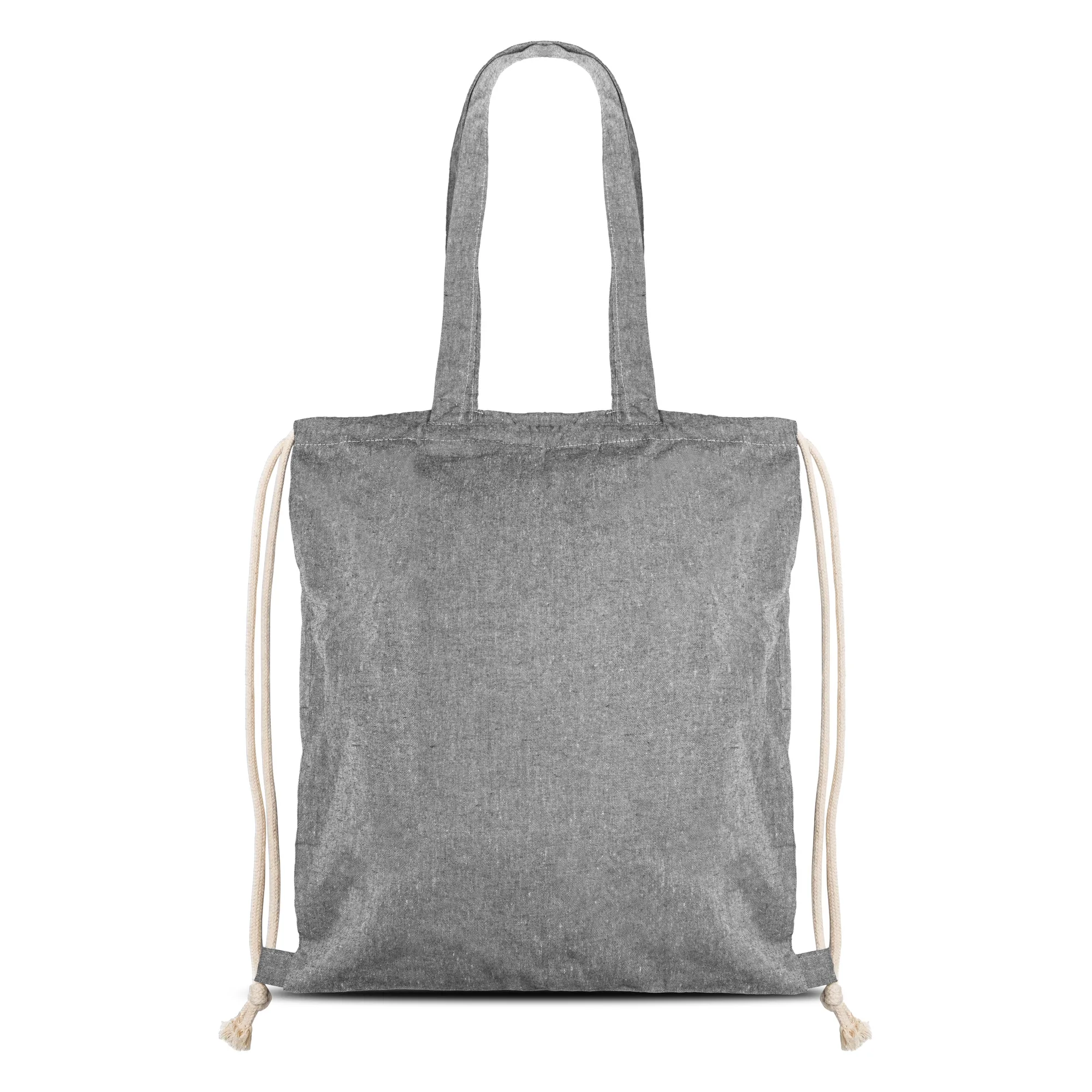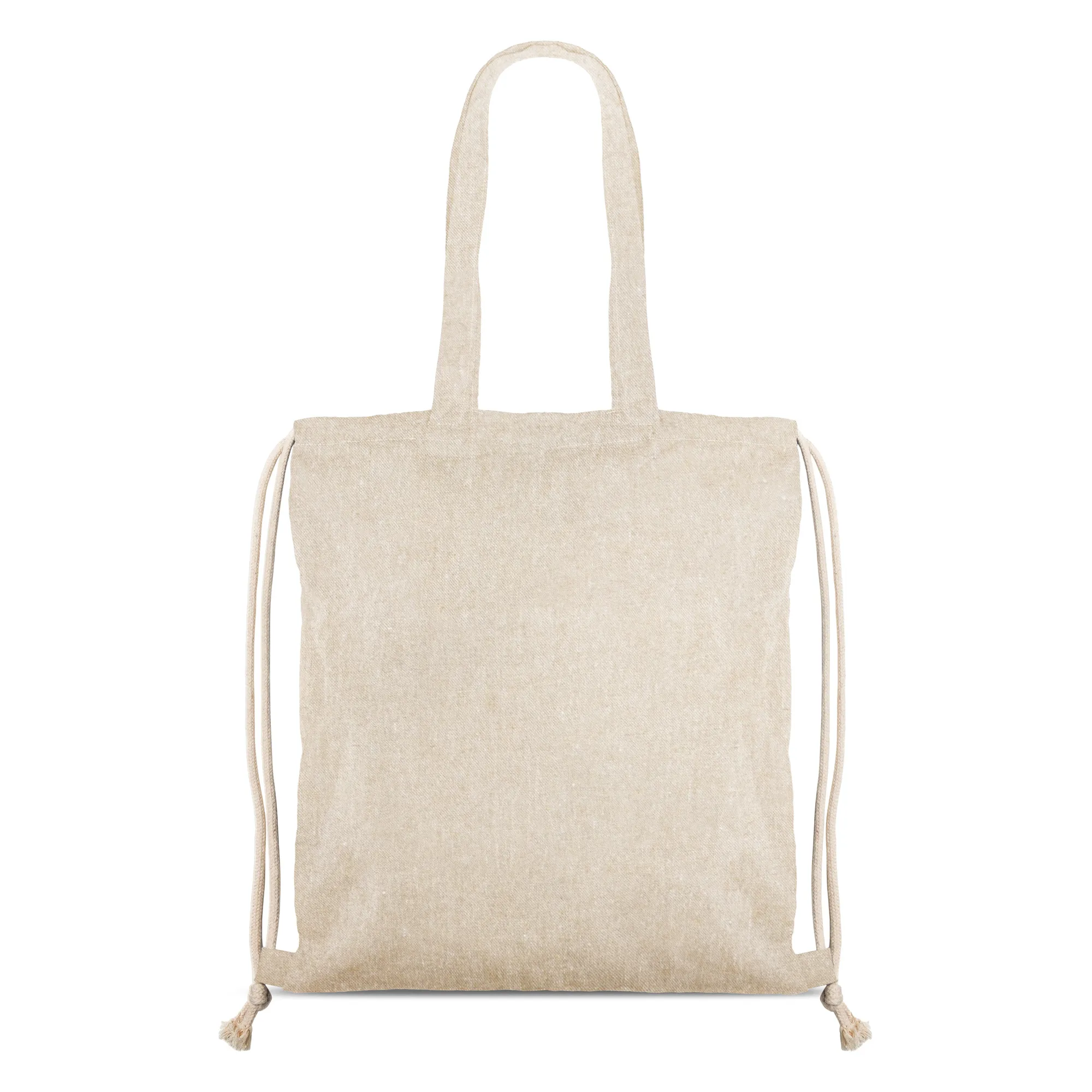 Saco mochila, asas longas em algodão reciclado 140g/m². Um brinde versátil, pois inclui alças de cordão para usar como mochila e asas compridas para usar como saco. Feito em material reciclado e ecológico.Saco mochila em algodão reciclado
